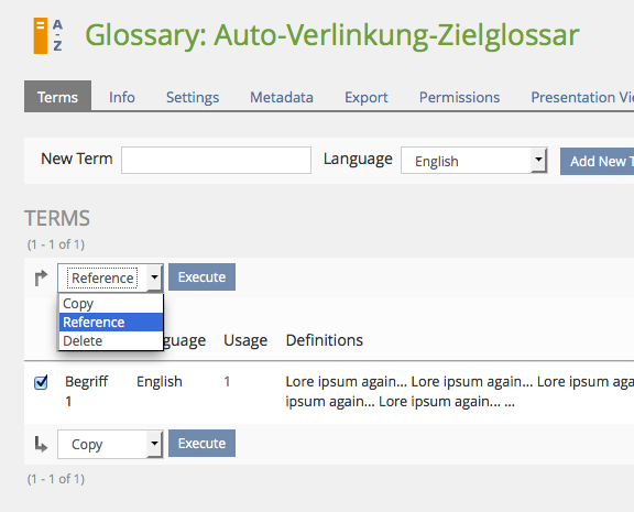 Glossarbegriffe können referenziert werden, dabei zeigen die Referenzen jedoch immer auf den Eintrag im Ursprungsglossar. In diesem Sinne sind die Referenzen nicht gleichwertig mit dem Eintrag im Ursprungsglossar, es sind "untergeordnete Verweise" auf den Eintrag im Ursprungsglossar. Die Schreibberechtigung am Ursprungsglossar ist entscheidend, ob der Eintrag geändert werden kann oder nicht. Das Einstellungen im Ursprungsglossar bestimmen auch z.B. die nutzbaren Styleklassen beim Editieren.