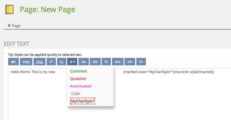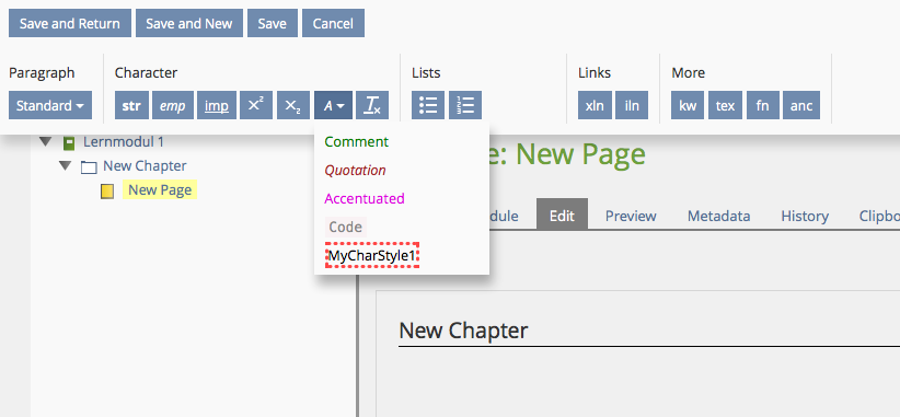 The ILIAS page editor allows to define and use as much paragraph styles as you like. But the number of character formats (span) is reduced to a fixed number. It would be highly appreciated if additional character styles could be created and imported, too. Importing a ILIAS LM from eLAIX with additional character styles requires to add span tags in the paragraph - which is not easy to read, frightens non-techies and is perfect to create a syntax error (by mistake).