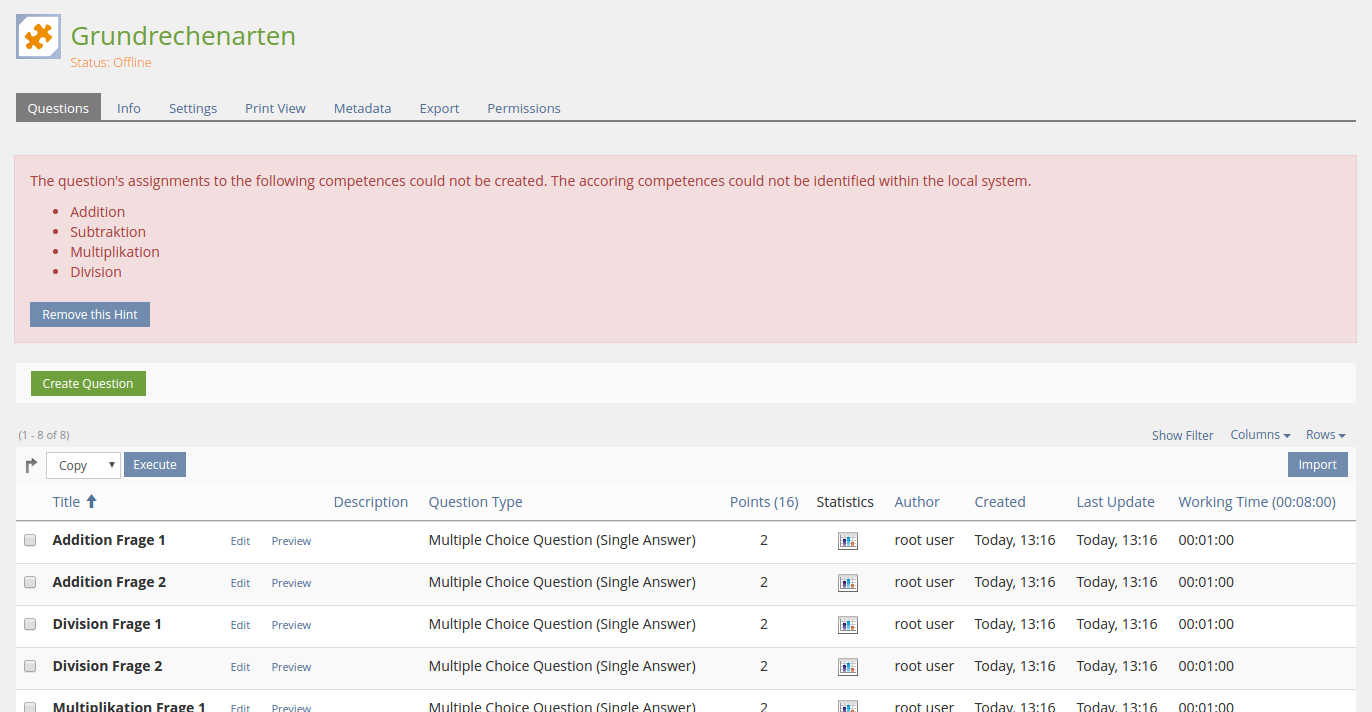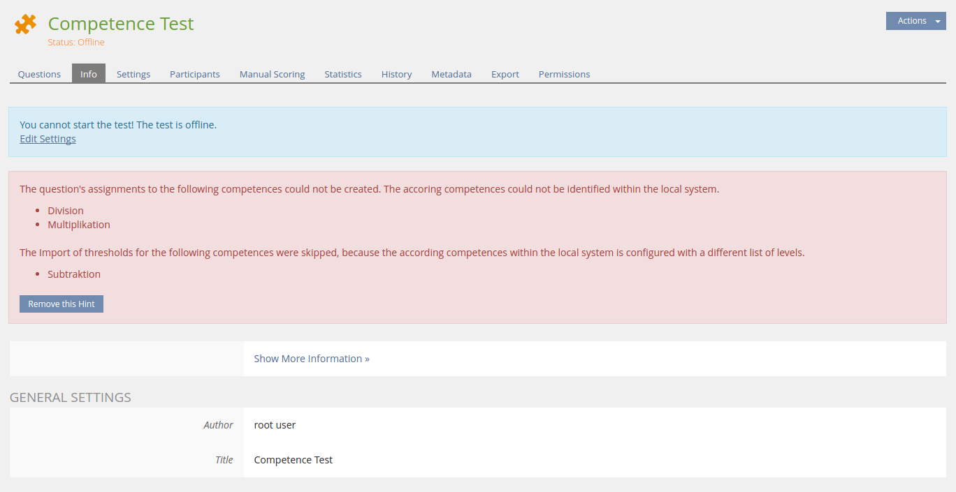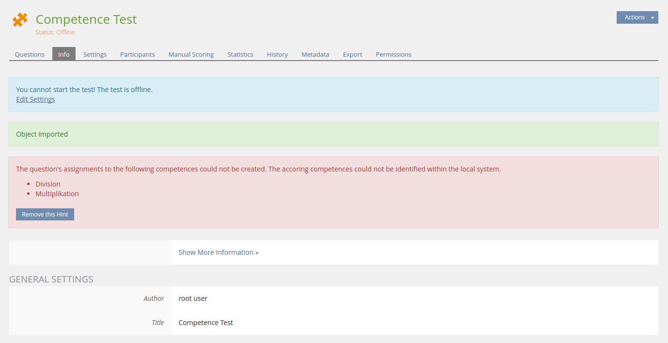When a pool or test object does contain competence assignment information that cannot be restored in the target installation, because they could not be identified (e.g. for the fact that the competences were not imported to the target installation), the pool or test object shows an alert listing the corresponding competence titles: