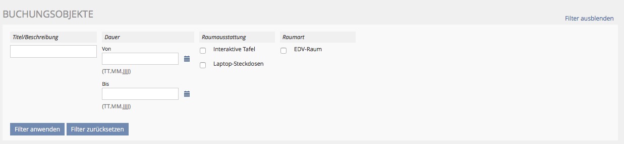 The bookingtool has a filter with no possibility to filter by period (Zeitraum). This should be enhanced, because that current solution makes no sense for bookingobjecs with timetables. Please compare current state and mockup below (Zeitraum).