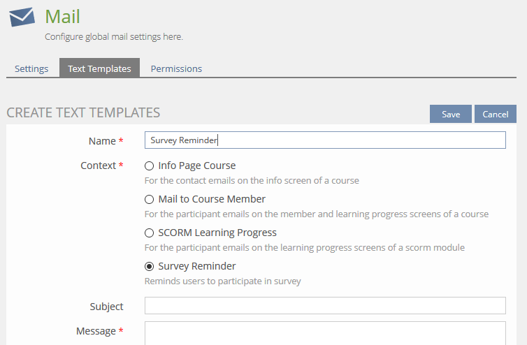 - In the "Mail"-Section of the Administration panel in the tab "Text Templates" a new "Context" is to be devised to allow texting mails for reminders in surveys.