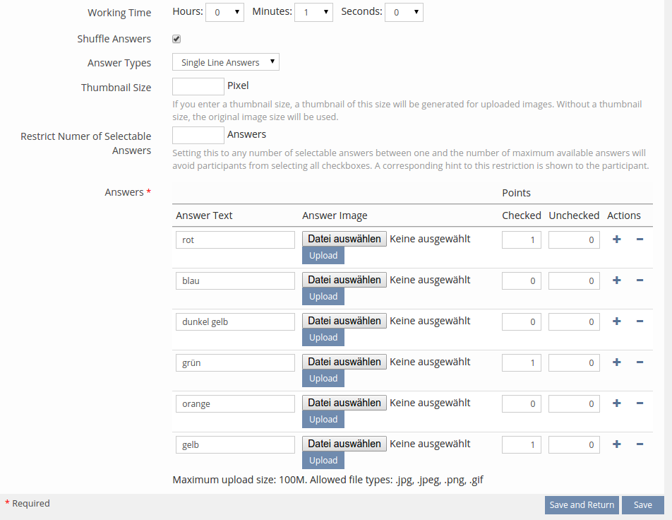 The number of selectable answers in a Multiple Choice-Question is determined by the input field "Answering Limitation". Please note the minimal value is "1". When entering a value greater than the actual number of possible selections, users receive an error message upon form validation. If the number of mandatory selections is supposed to be unlimited, the field is to be left empty.