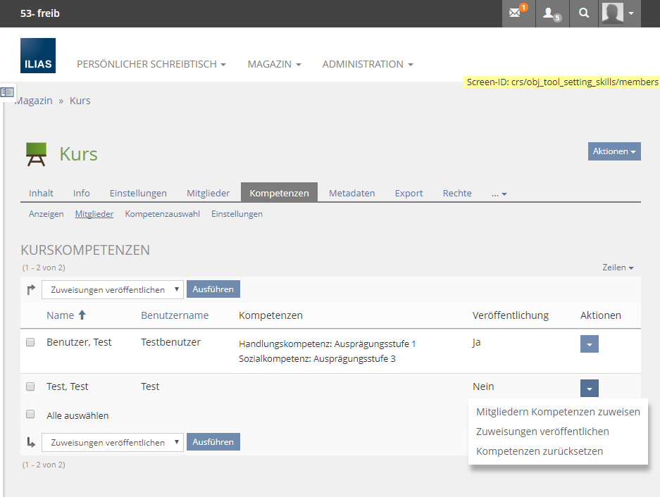 - Publish Evaluations: Will finally assign the competence levels to the members. Before this step is done, assignments will only be stored internally in the course, the competence management will be called when competences are published.