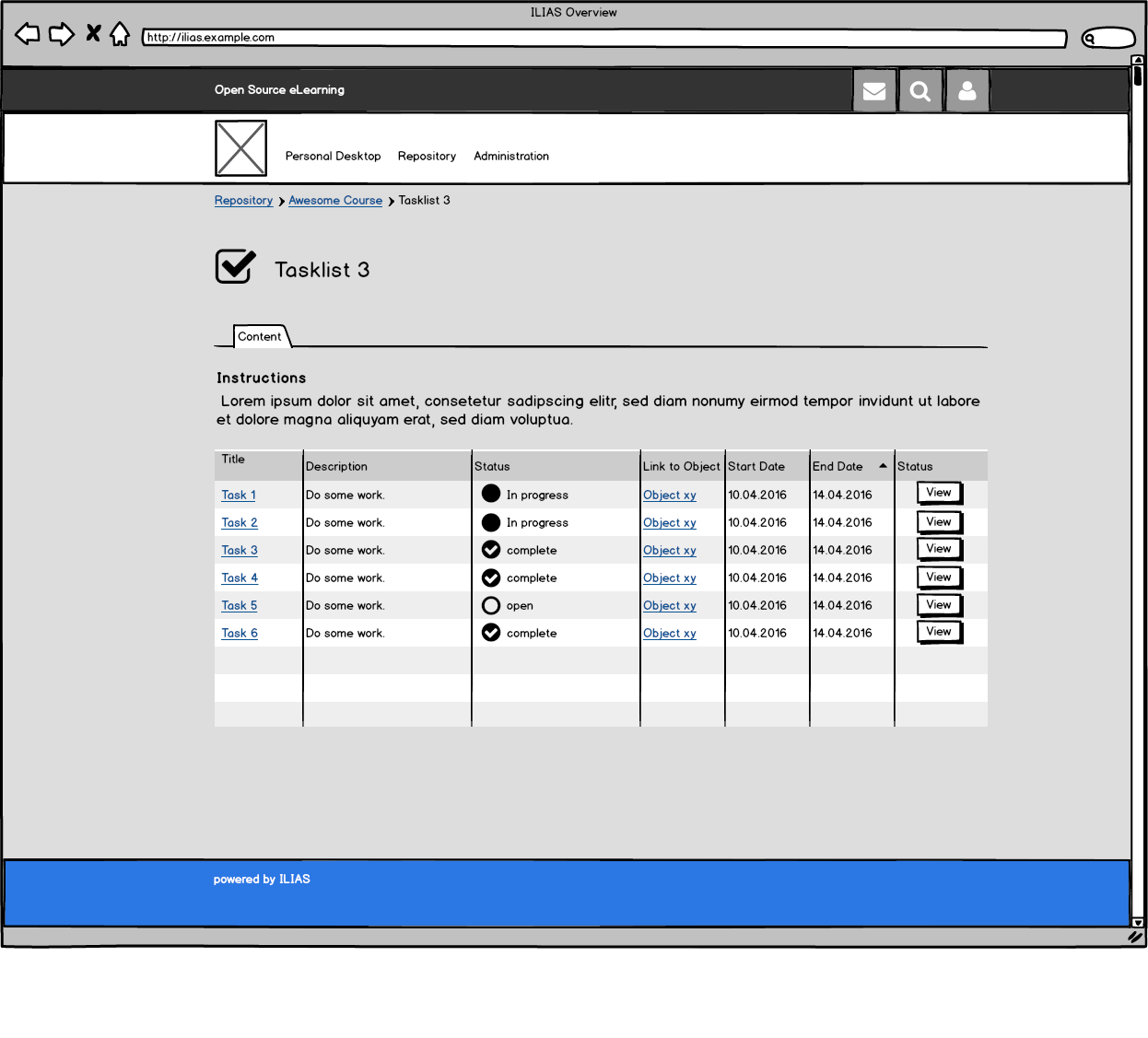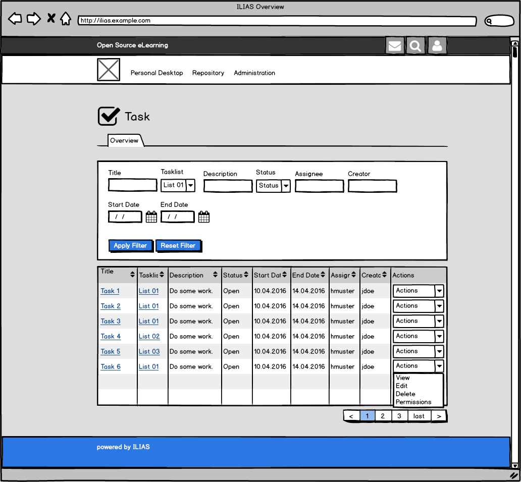 - An arbitrary number of tasks can be added to a Tasklist. Besides a title and description, a task has a status, a mandatory type, a due date, can be linked to an ILIAS object, can be commented and more.