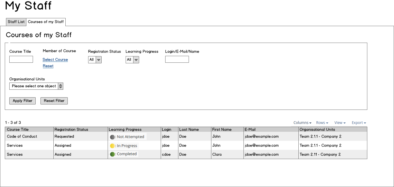 - News: It would be helpful to be fed news about changes in Learning Progress Status, newly acquired memberships in courses, newly acquired competence levels, certificates and the like. This could be another tab of My Staff.
