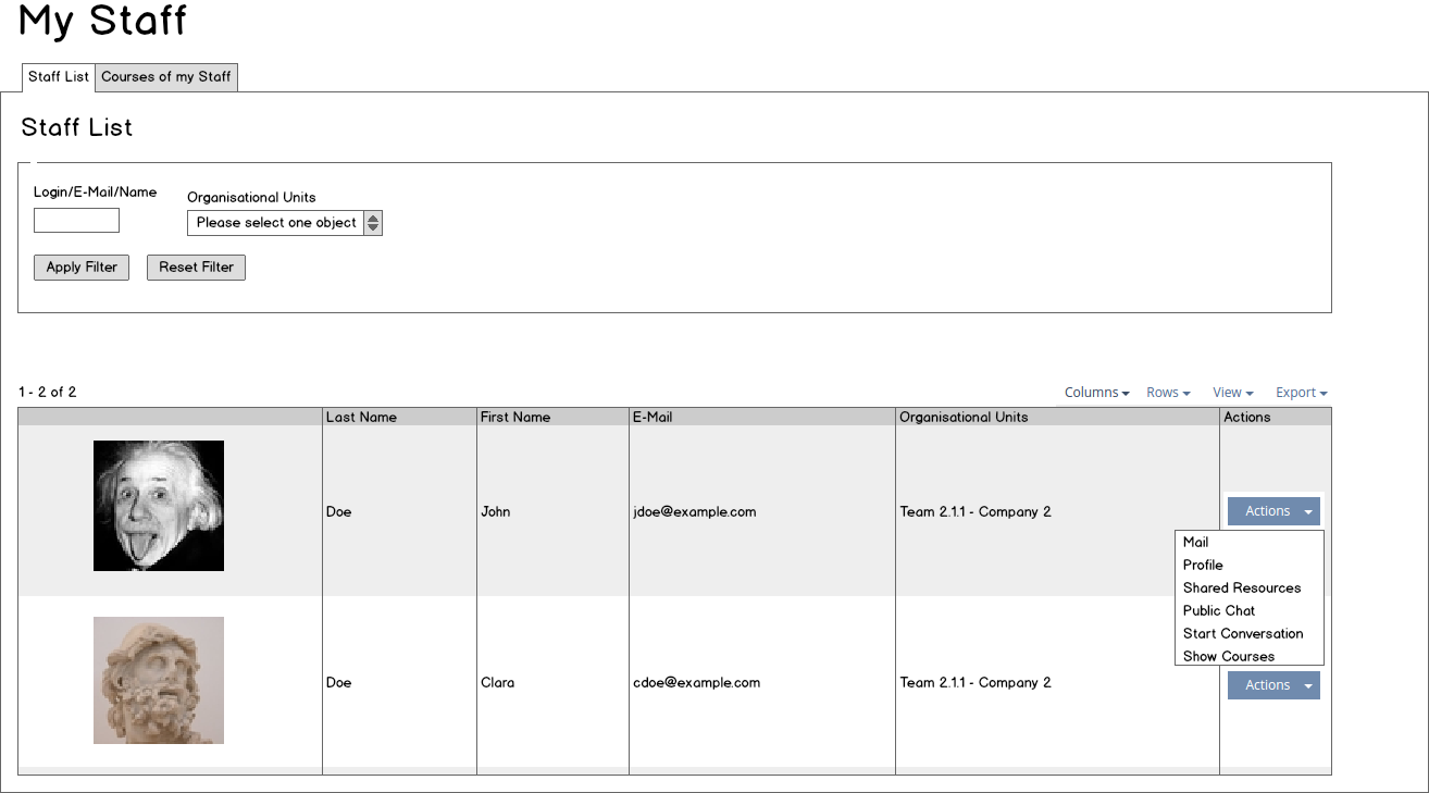 The feature "My Staff" can be enabled globally (disabled by default). It should also be possible to enable/disable the sub-features. We suggest to start with three different views: