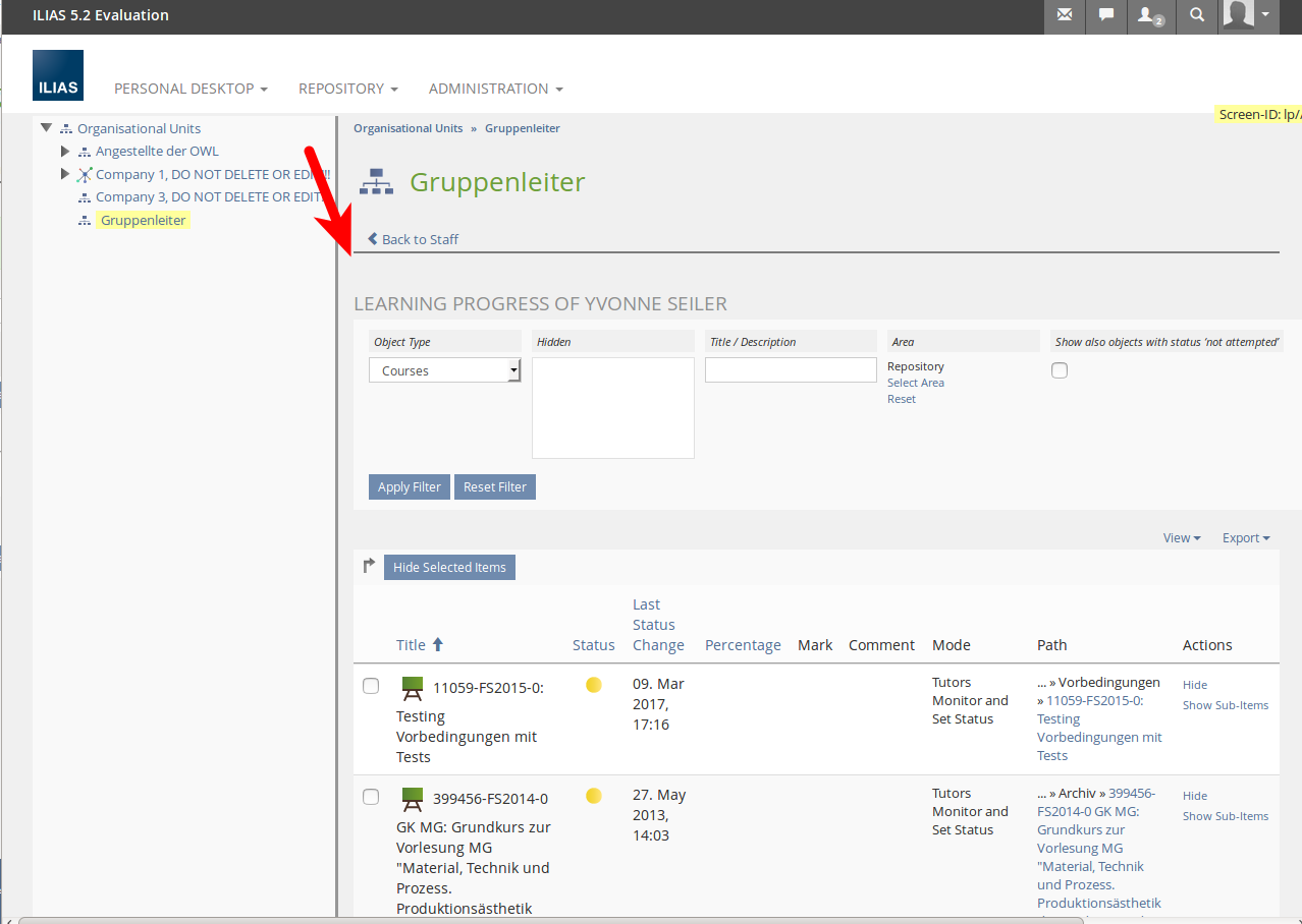 - The views 'Show Courses' and 'Courses of My Staff' are important administration views for superiors. Therefore, using them should be as powerful as possible. At the time being, both views just list objects but do not offer to access them immediately. I suggest to link the course titles in ‚Show Courses‘ and ‚Courses of My Staff‘, the org unit titles in ‚Staff List‘ and in ‚Courses of My Staff‘ and the login in ‚Courses of My Staff‘. Does JF agree?