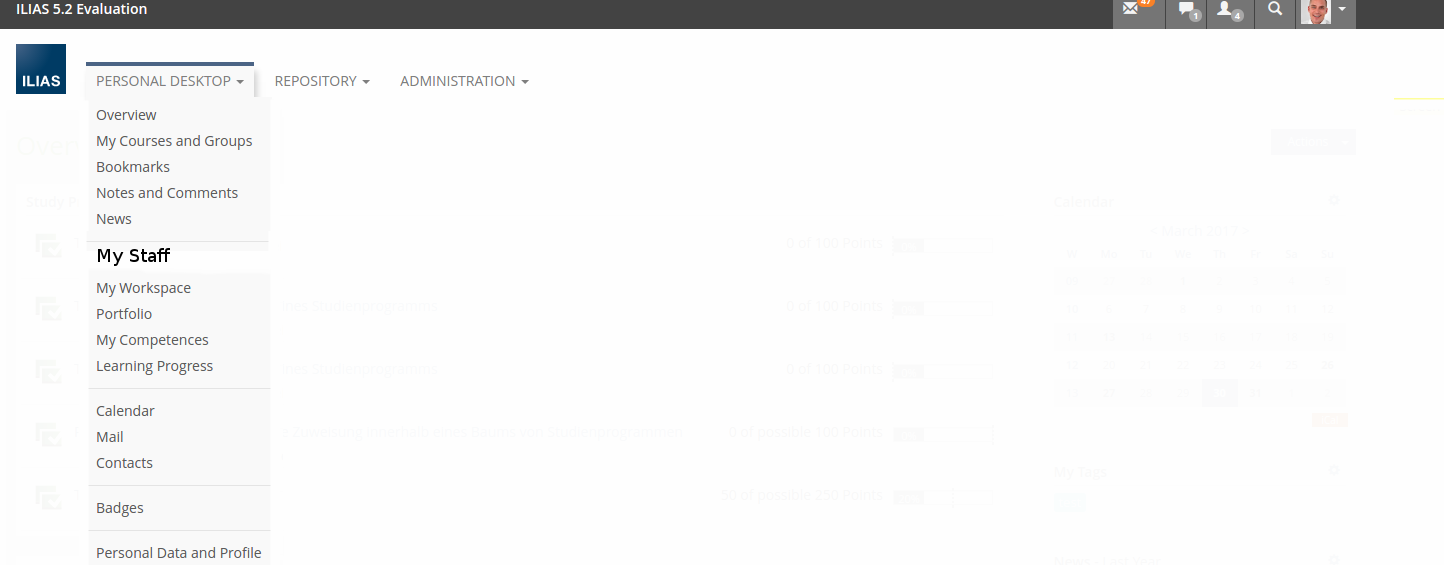 - mentoring: Mentors could share the same or a similar dashboard as my staff. However there is not a dedicated mentoring concept in ILIAS yet. As a workaround a mentor could be something similar as a superior in the org-structure.