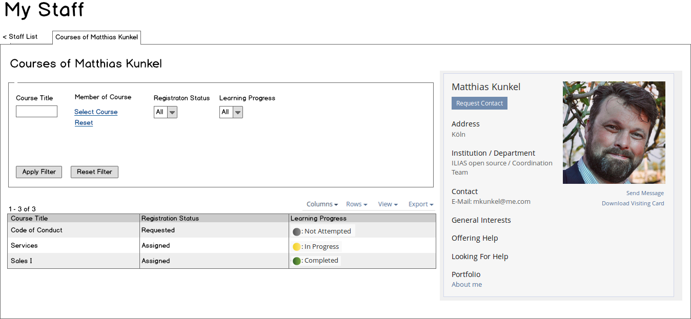 - The Tab "Courses of User XY" is very unusual for ILIAS. It will not work on small screens. Could you please drop the two columned layout. Please feed this past the kitchesink. This is a new collection and needs an entry.