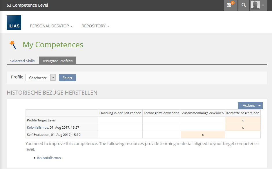 - In the list of recommended materials for a competence level, ILIAS should offer: