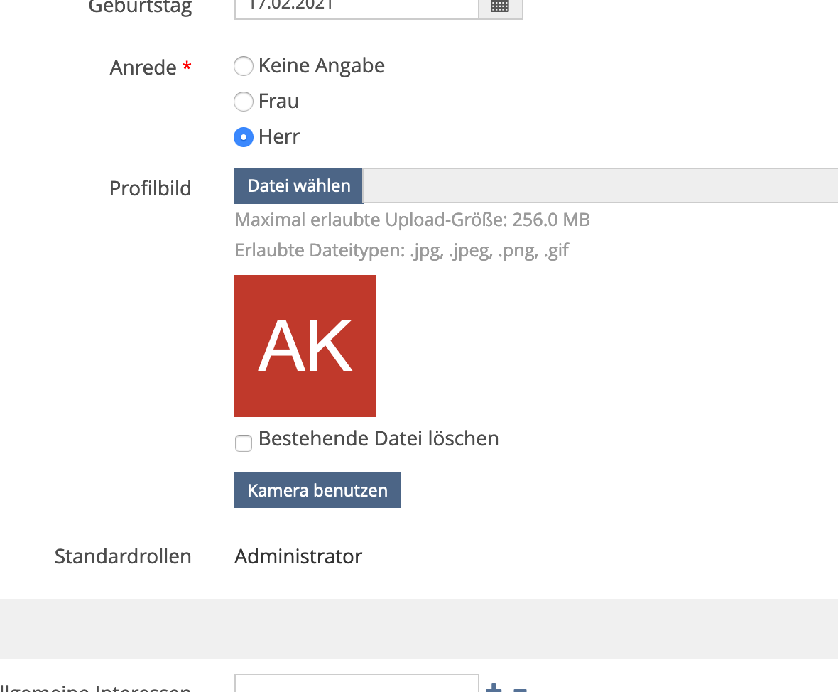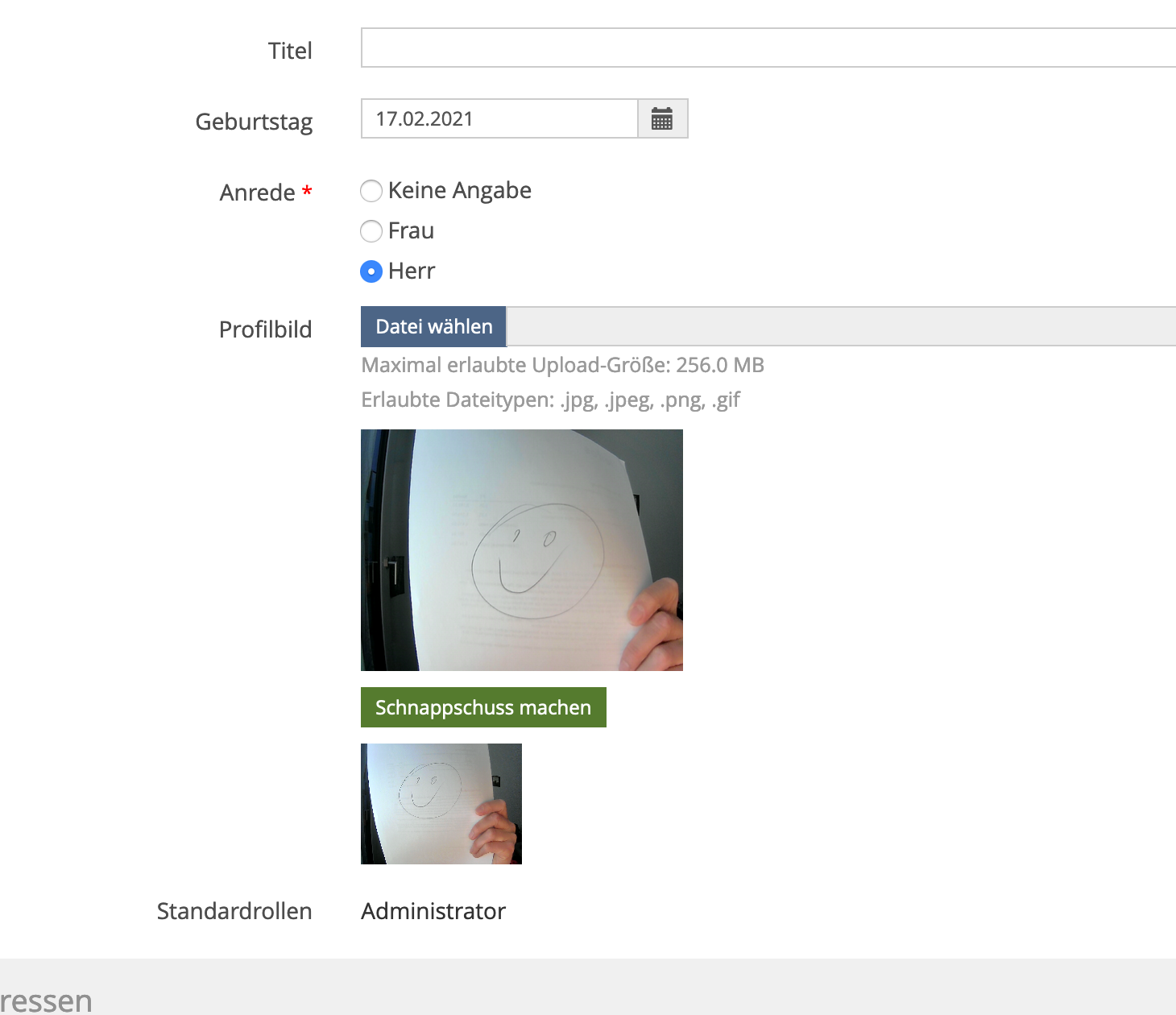 In the settings "Personal Profile > Profile and Privacy" the "Avatar" area is extended by a button that allows users to take a profile picture using the buldin camera of the corresponding device. Users click on the button to open the camera program, users can take a photo and then upload it.