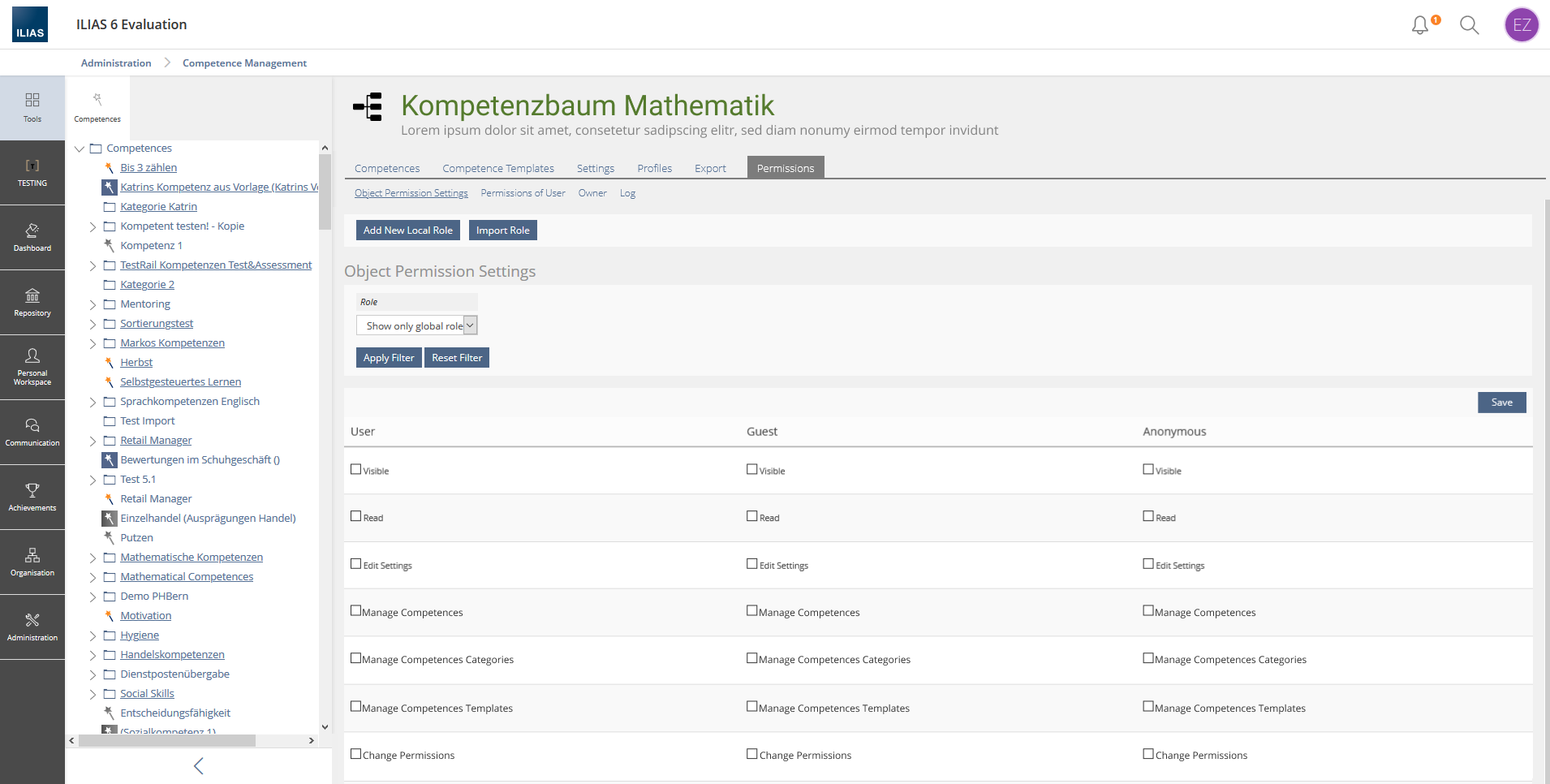 Competence categories get their own tab 'Permissions'. In the 'Permissions'-tab local roles can be created, roles can be imported, global roles can be assigned permissions. The Permissions are