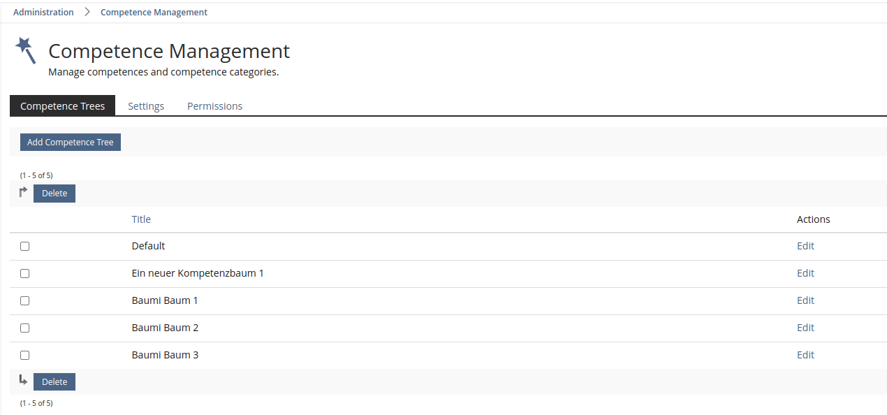 Competences and Competence Profiles can only be created, edited and organised via the Administration. If you give a role the Permissions "Visible", "Read" and "Edit Settings" for the administration entry "Competence Management", the role can edit all Competences.