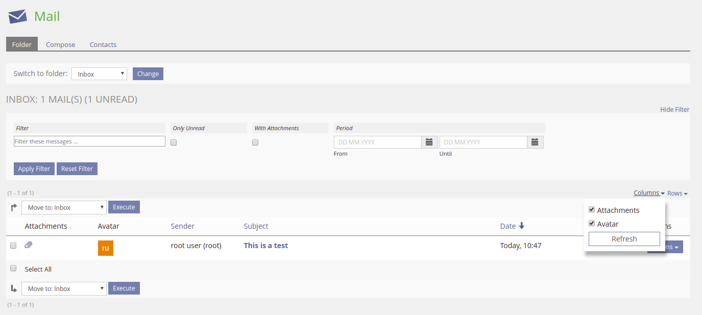 Therefore we suggest to add an optional period (from/until date) filter as a 2nd filter element to the folder table view. If submitted, the entered dates will be compared to the creation date of each email in the database.