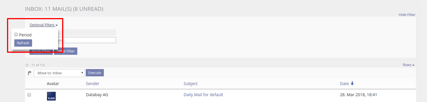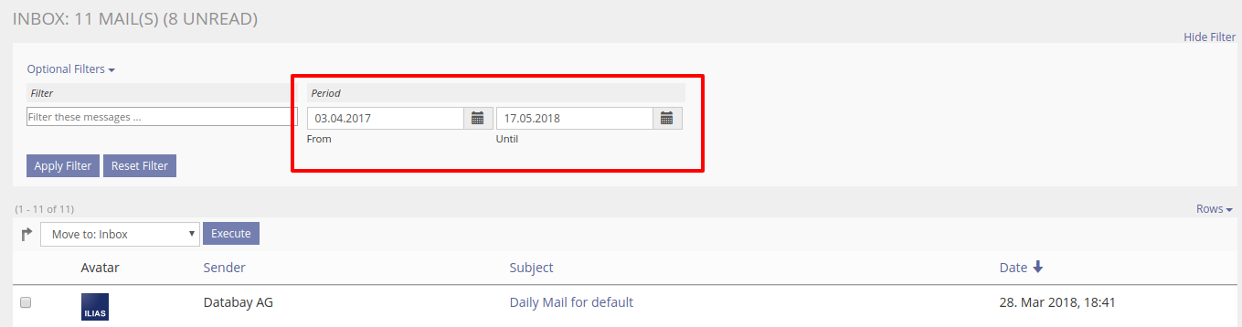 By now (version 5.3.x) there are already some filters available in the ILIAS mail system (sender, subject, body, attachments). However, with more and more emails arising over the years, you might also need a date filter to find what you are looking for.