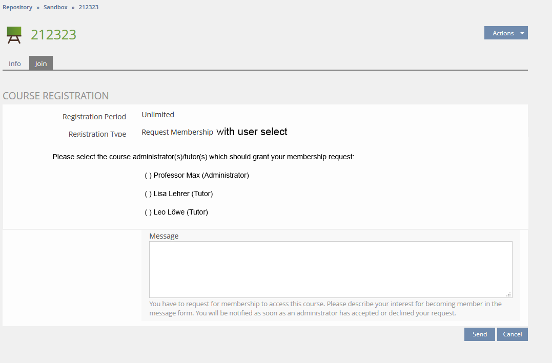 When this option is active, and the learner gains access, he will be asked to select which tutor/administrator of the course should approve his membership request . After clicking "Request membership" the membership proposal is only sent to the selected tutor/admin.