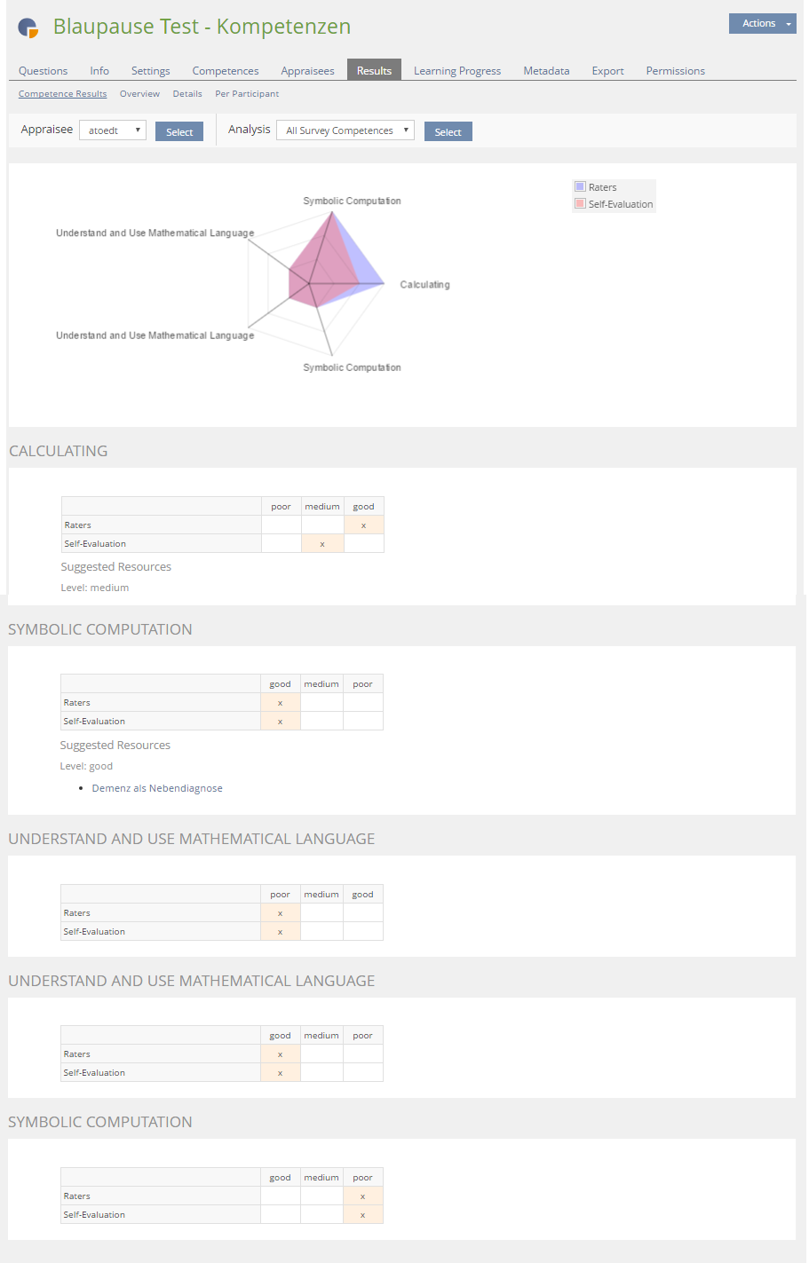 - The set of competences shows a record for one point in time: survey can only be taken once for tests it will always be the most recent test run.