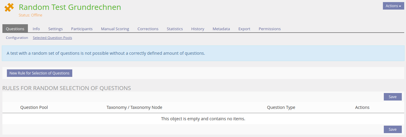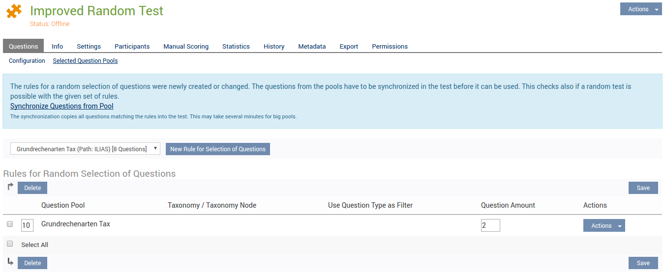 - The selection field that is used to choose the question pool for a new rule to be added is removed from the screen that is shown in the screenshot above. The button to invoke the creation of a new selection rule is kept.