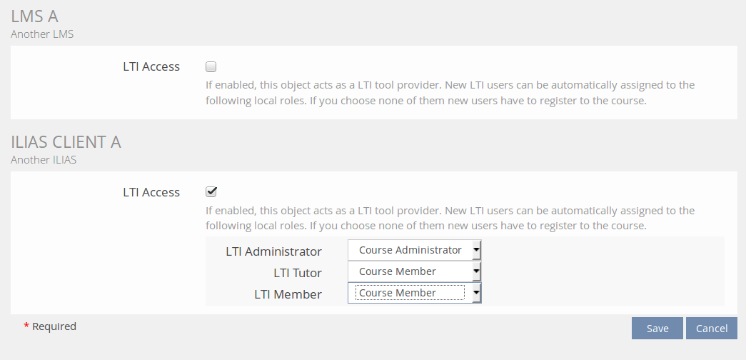 - Objects that do not support auto generated local roles, will provide a mapping screen for the assignment of LTI roles to predefined ILIAS LTI roles.