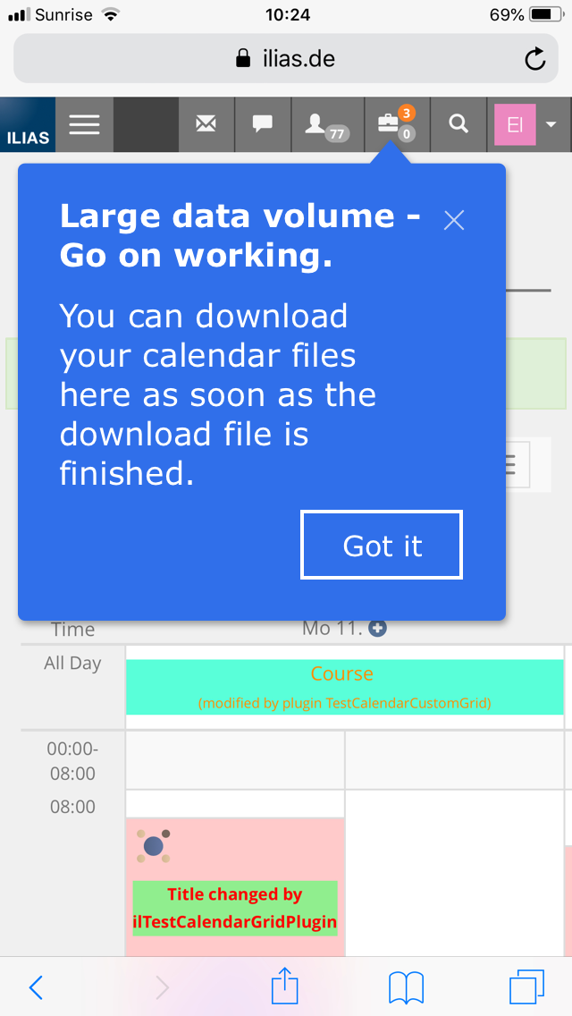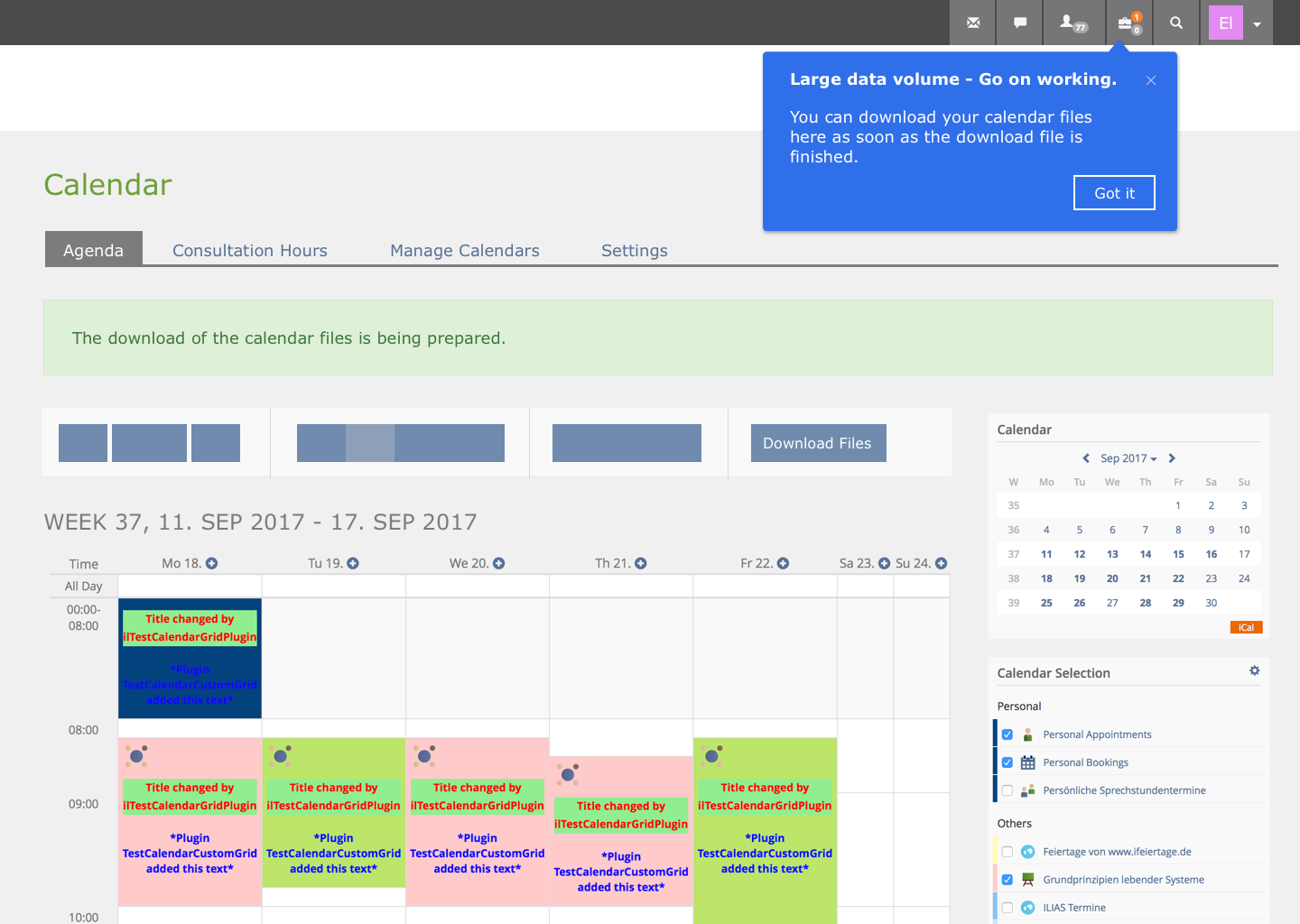 Kiegel, Colin [kiegel] 2016-11-30 I'm not a big fan of this prominent placement of a "download files" button. I prefer download actions per calendar entry (e.g. in the action menus in case of the "Agenda" calendar view). I would really like to keep the main calendar interface as simple as possible. In that sense I would be happy if this "Download Files" button is feature-gated behind a setting and off by default.