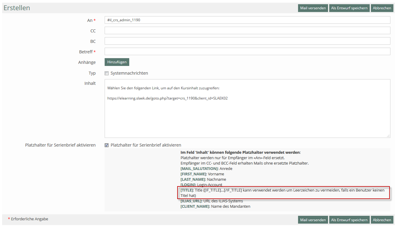 Kunkel, Matthias [mkunkel], Jan 12, 2017: It is good to support the title in such mails. But please avoid the [IF_TITLE] procedure and let do this by the ILIAS automatically. Even I have often problems with these IF_... constructs. A usual user is overstrained.