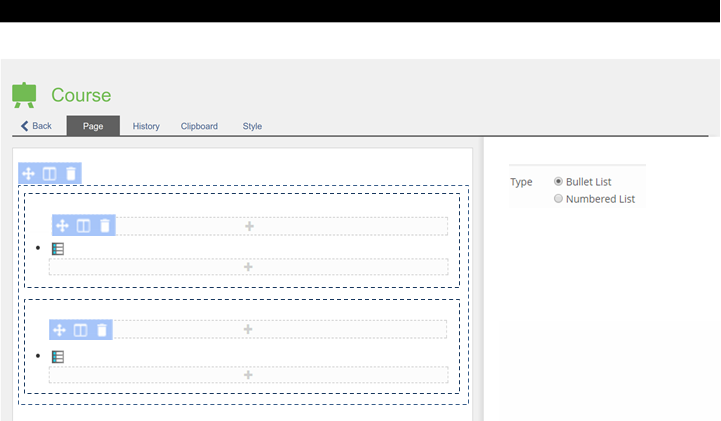 - Users can move, divide and delete blocks over a special mini-menu in the left upper corner of the content block. Divide blocks indicate that users can add columns.