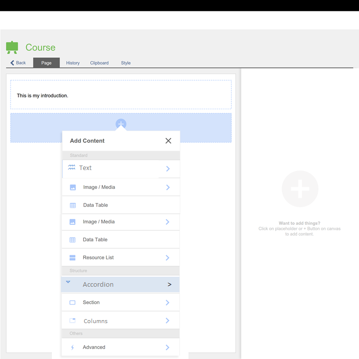 - A add-new-content glyph (+) provokes a drill-down-menu offering content elements.