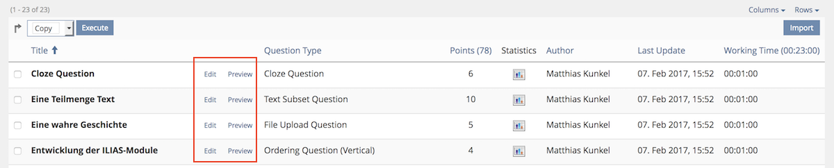 JourFixe, ILIAS [jourfixe], March 13, 2017: We highly appreciate this suggestion and schedule it for 5.3. The question title should be a link and lead to the 'Preview'. 'Preview' should also be the first item in the dropdown (new rule). Besides 'Edit', 'Move', 'Delete' and 'Copy' the dropdown should also list 'Edit Page', 'Hints' and 'Feedback' (and future tabs of a question).
