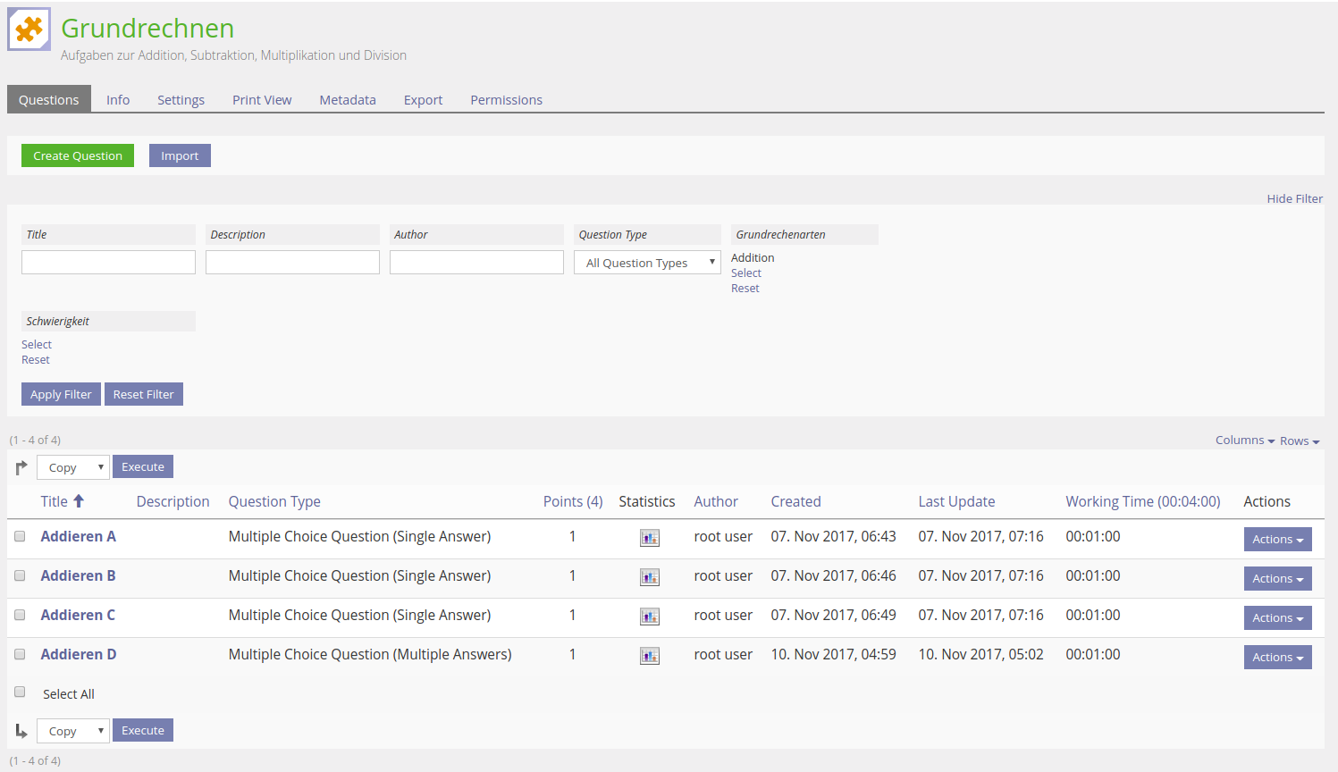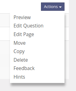 The actions menu provides the links for previewing and editing the question, that were provided in the table row before. Additionally it provides the links for editing the question page, the feedback and the hints of the question. Also the move and copy actions are now provided for each question.
