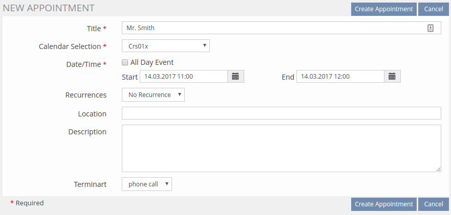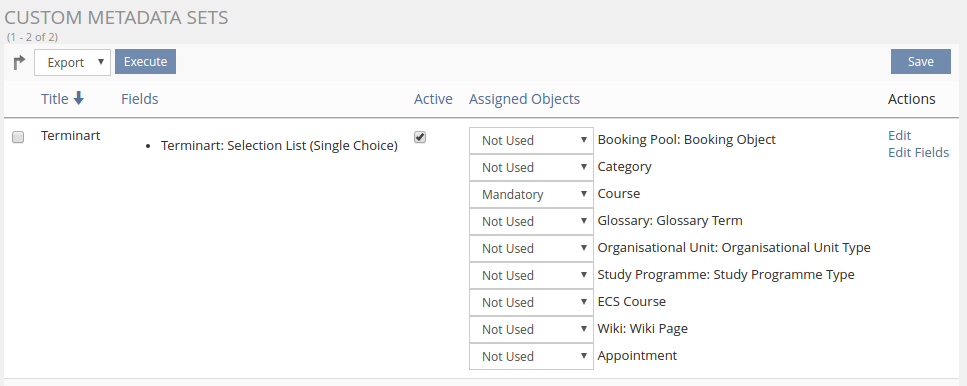 In the adminstration section for metadata you can add custom metadata sets and assign them to objects. We suggest the extension of the object list by "Appointments".
