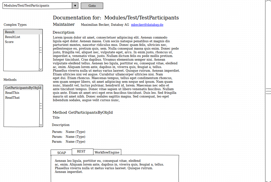 As shown in the wireframe, which is please considered abstract, class and method docblocks of designated APIs (see 4 for further details on that) are displayed in a human readable and easily navigatable way.