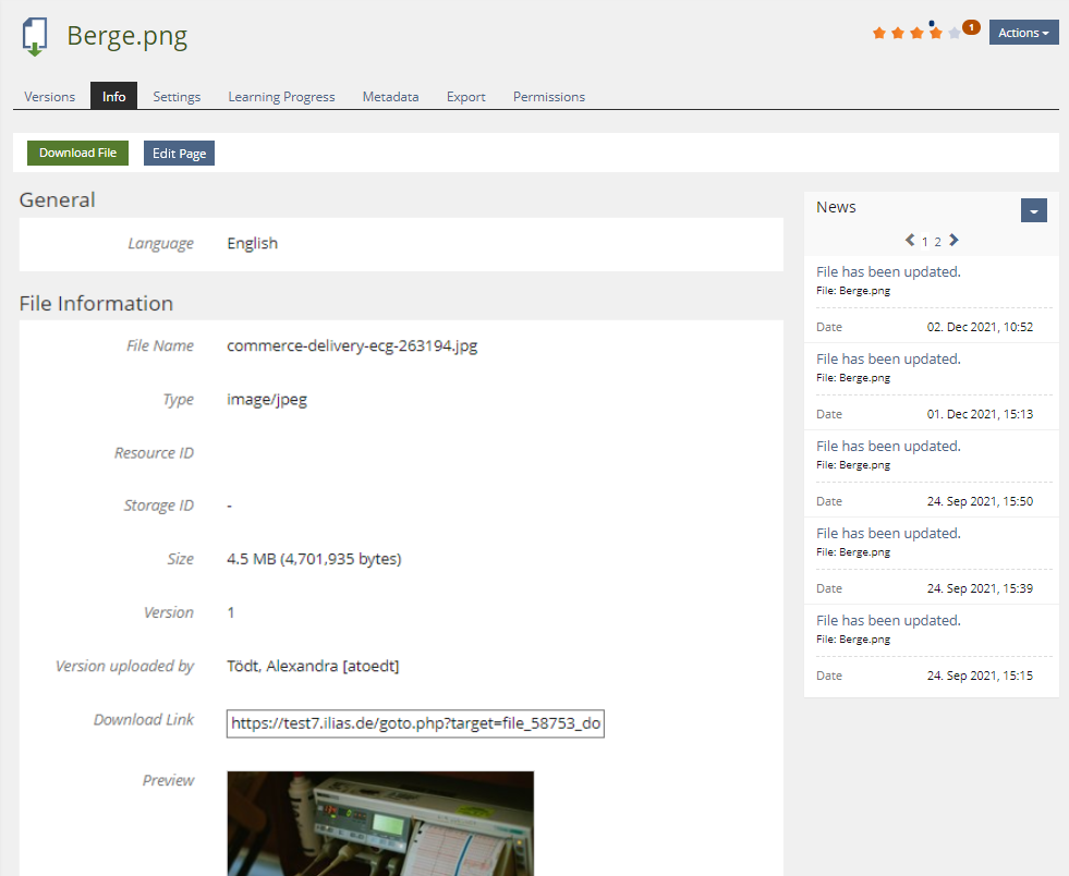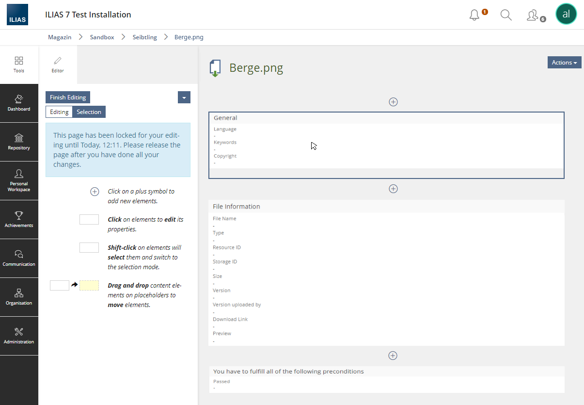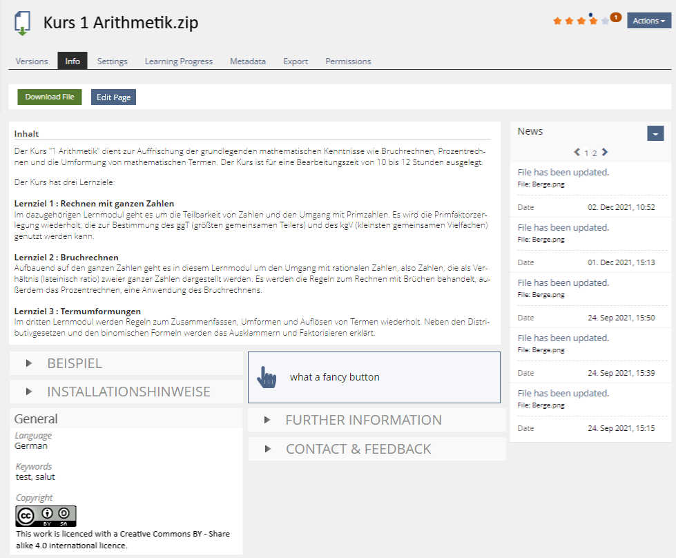 - The Info page allows adding ILIAS page editor content. User with "Edit Settings" permission get an "Edit Page" Buton on the Info-tab.