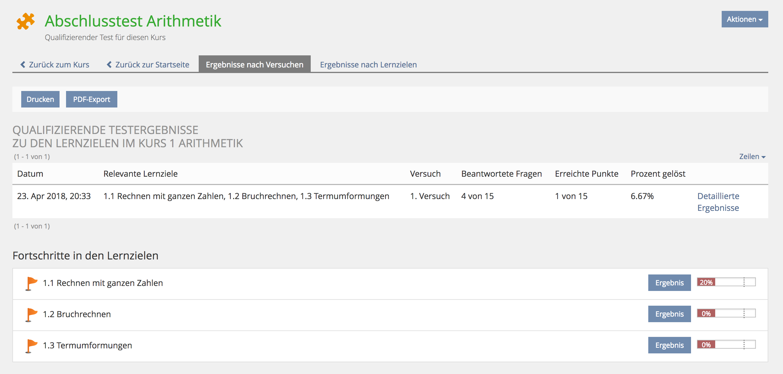 Users are often spacy when finishing an inital test. They would prefer a clearly indicated way to return to the course where they started the test. They miss the links "Back to Course" and "Back to Start Page" in the tab bar due to the presence of the Print and Export button.