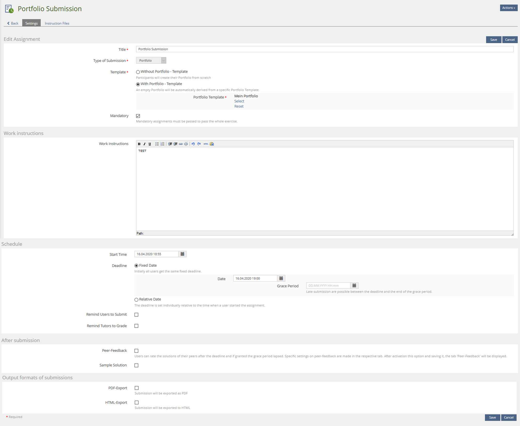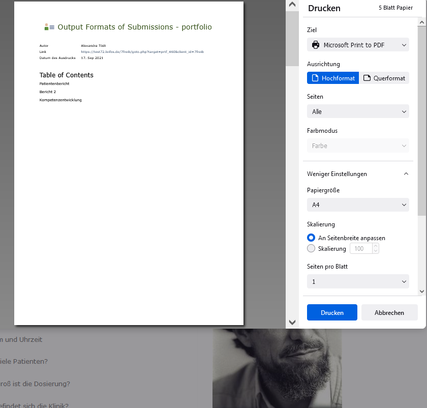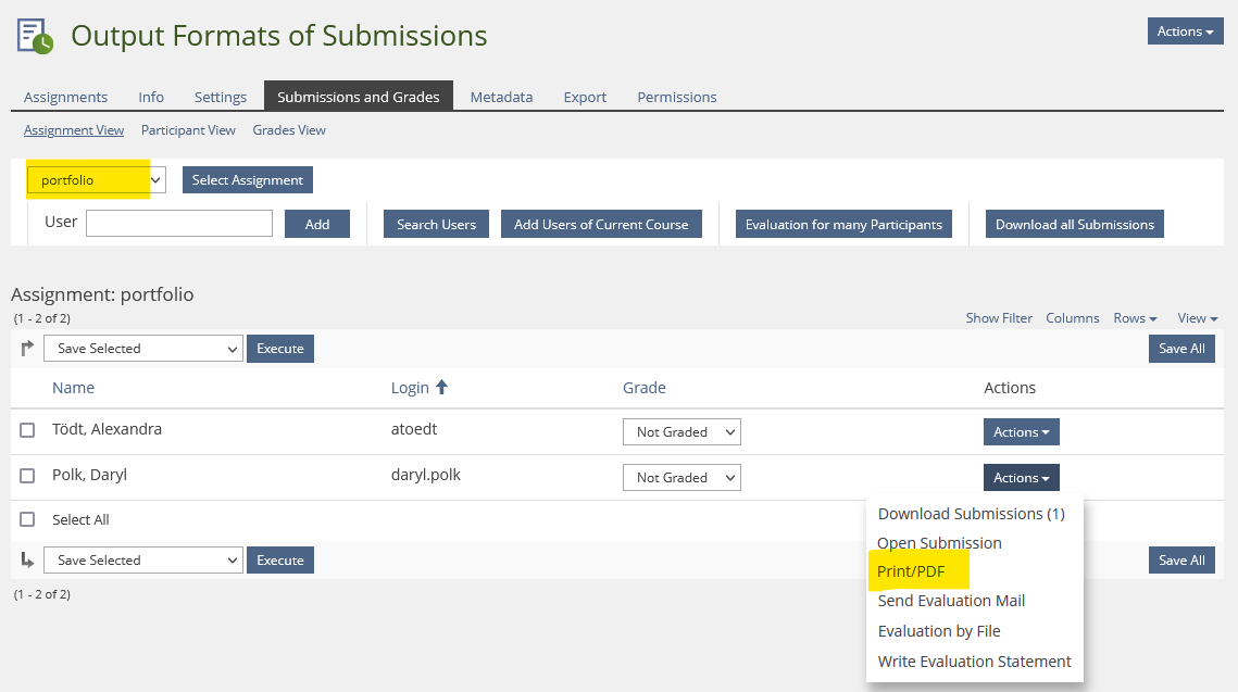 In the tab 'Submission and Grade' the assignment types Blog, Portfolio and Team-Wiki offer a new action once the assignment was submitted: Print/PDF.
