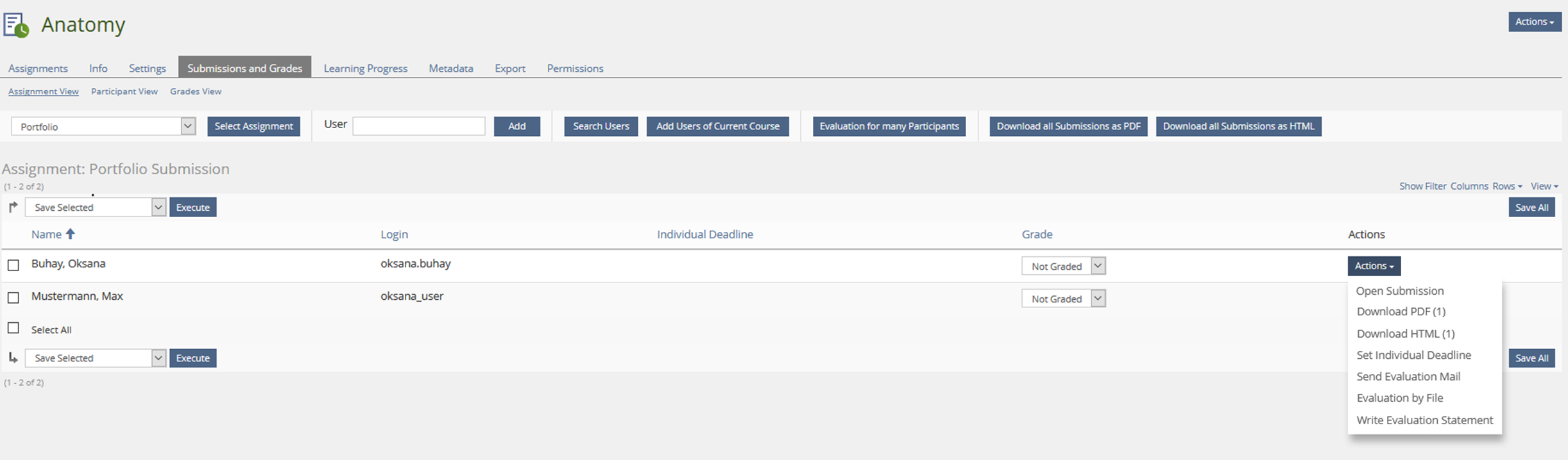 As an alternative, I could imagine that (1) all three variants would have "Open Submission" (if not already available), (2) the HTML export would be displayed in every case (as before) and (3) an option for an additional PDF export would be available for each assignment task (whether it can be selected by the user or is even available by default, because I assume that hardly any user will deactivate the PDF export if it is offered.