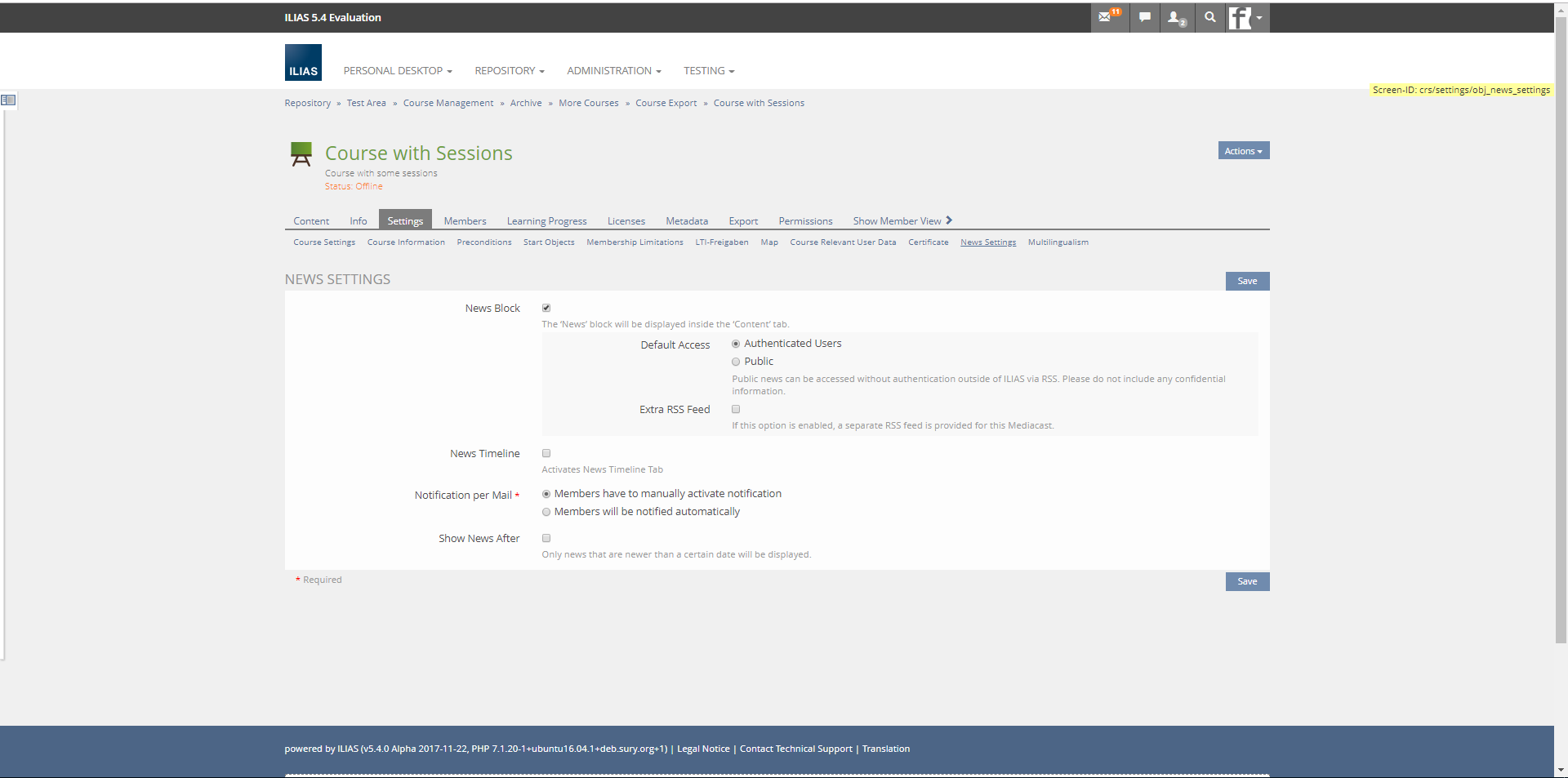 Glaubitz, Marko [mglaubitz], 20.09.2017: For our users, finding the news feature and turning it on has become a problem, because the settings are hidden in the current implementation. Many lectureres have wondersed, why we have turnd the news feature off for their current courses. These seetings need be more central - thanks for bringing this up, Alex!