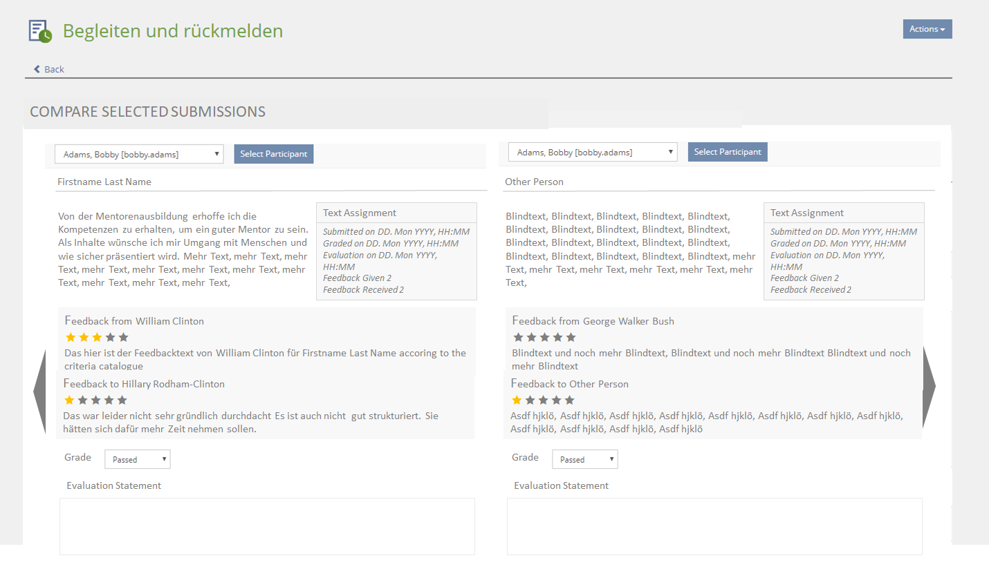 - Option 2: ILIAS shows the first two selected submissions in Reporting Panels next to each other. The selected users can be flipped through in a first-in-first-out fashion. On top Users can be selected for one of the two slots.