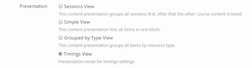 - If we remove 'Learning Objectives-Driven Course' from the list 'Presentation Type', why handling the course with timings differently? It also comes with new functionality and does not only present course items in a different view. Why does it not become a type and stays just a view?