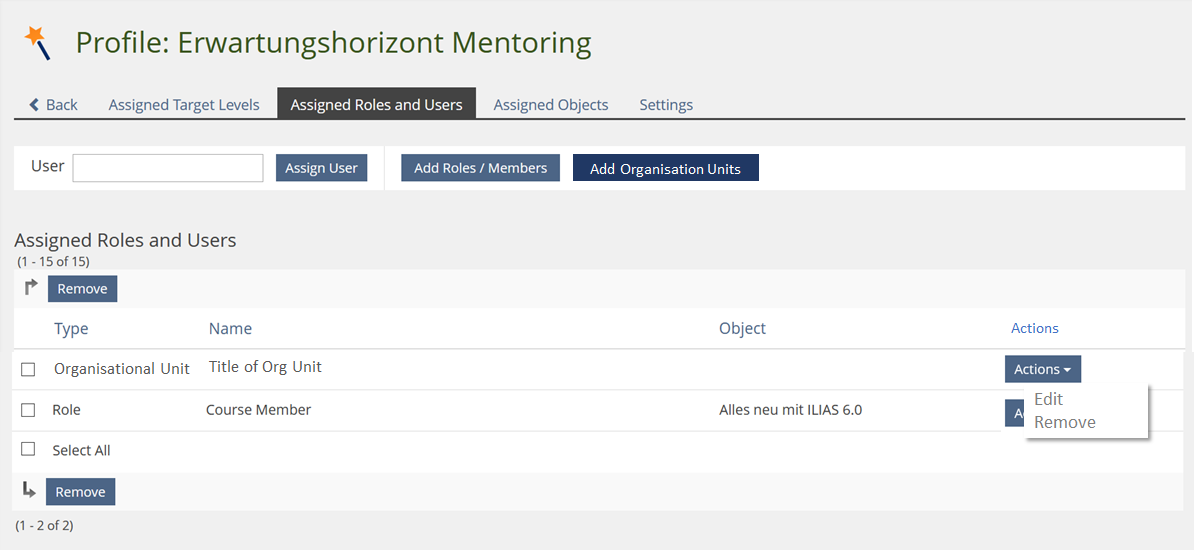 Famula, Thomas [tfamula], 12 MAY 2021: I agree with Matthias. The workflow ist also not clear to me. As already mentioned in the comment of the JF from 11 MAR 2019, please have a look into Competence profiles can be assigned to Roles. This feature is available since ILIAS 6 and maybe we can adapt this workflow for org units, too? So please update the mockups accordingly, because they seem outdated to me. Please also add a screenshot for the table "Assigned Roles and Users" to show how the assigned org units should be represented together with assigned users and roles.