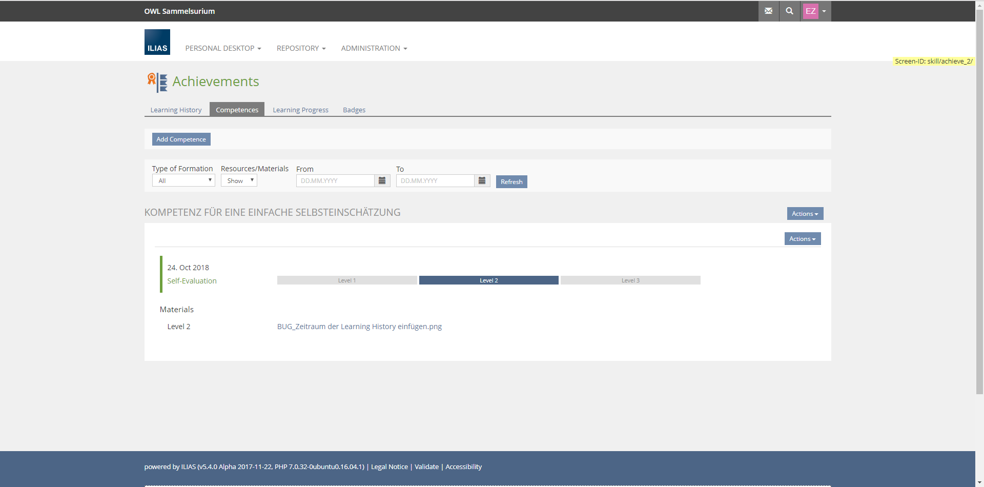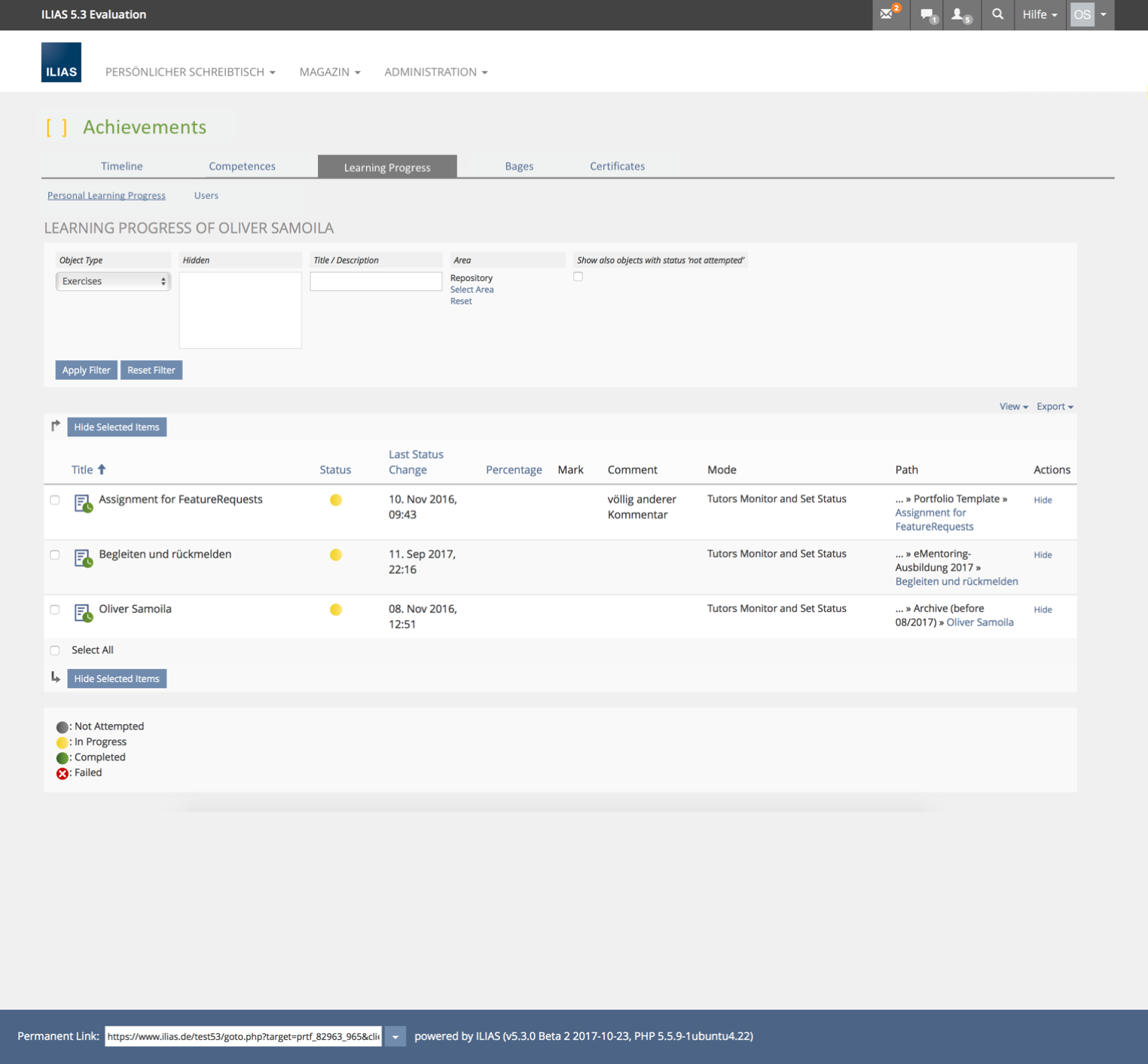 In ILIAS, different perspectives on one's own learning can be taken: competence orientation, learning objective orientation, learning progress and informal learning about badges.