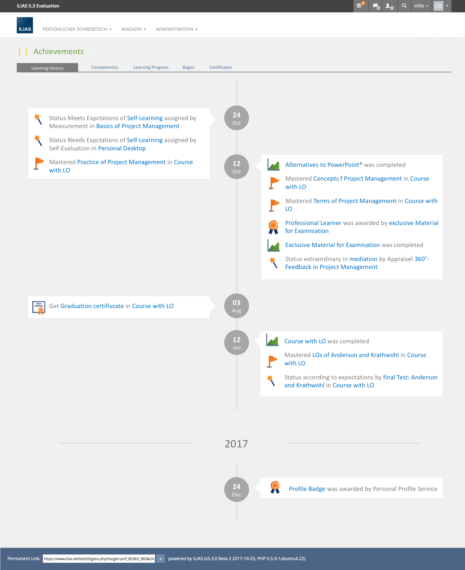For this purpose, the elements "Competencies", "Learning Progress" and "Badges" should be summarized in a common main menu entry "Learning History".