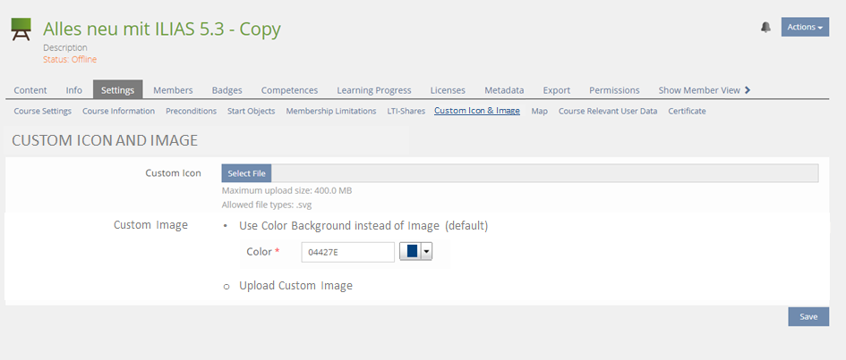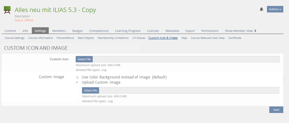 - The upload form for the tile image should be moved to the first sub-tab of Settings in section "Presentation". Same should happen with the custom icon (for category, courses and groups).