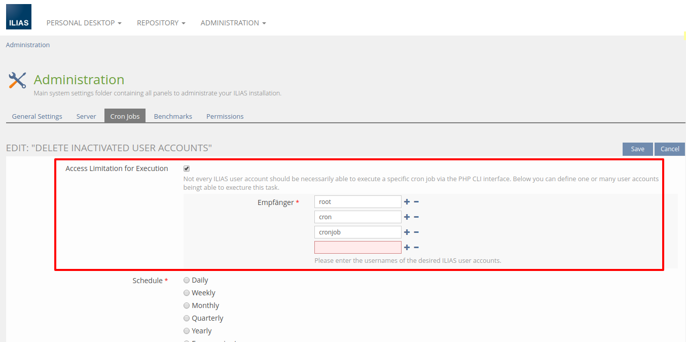 - A user with 'write' permissions (in respect of RBAC) at the 'Administration' node should be able to optionally define/configure a list of 1-N ILIAS user accounts being able to execute a specific task. If a user in an authenticated CLI context executes the cron job script and is not allowed to run a specific task, ILIAS should log this event appropriately to the global ILIAS log file.