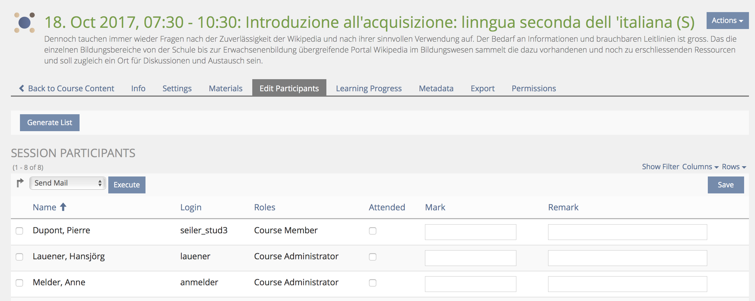 - ad 2.3: If setting "No Registration Necessary" is set only those users are listed as participants that have a checked 'participated' checkbox.