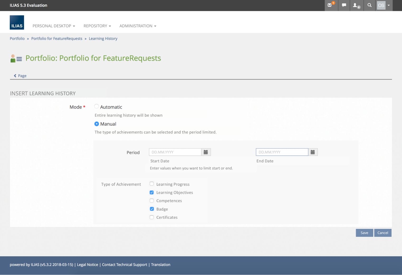 JourFixe, ILIAS [jourfixe], 16 JUL 2018 : We highly appreciate this suggestion and schedule the feature for 5.4. We prefer to have a "Show more" button for showing the next bunch of entries. Print and PDF export should show all entries according to settings of the learning history - automatic or manual.