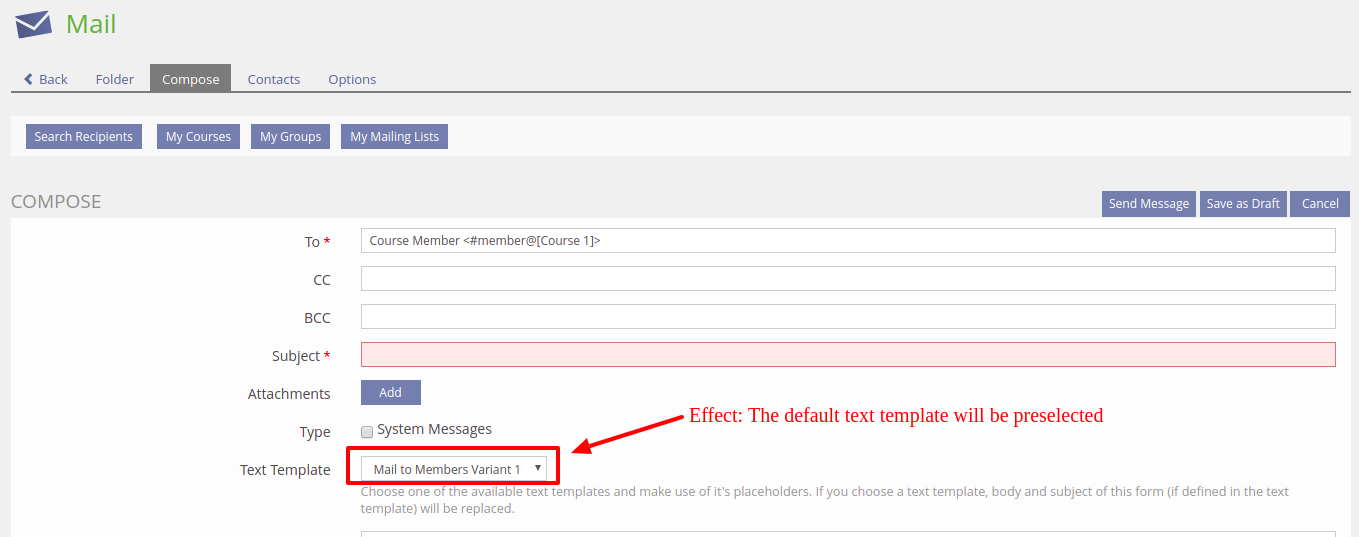 Example: There are two text templates A and B created for the context Mail to Course Member. Now an administrator should be able to select either A or B as the default for this context.