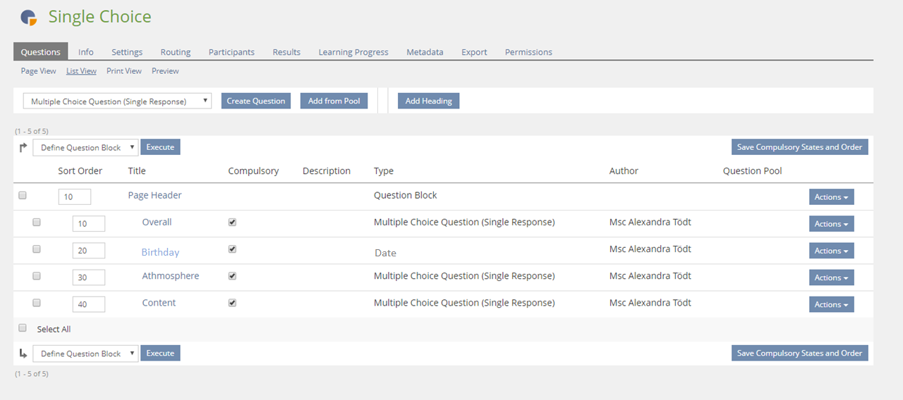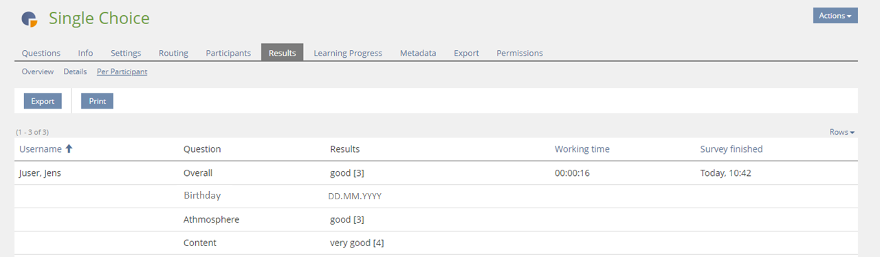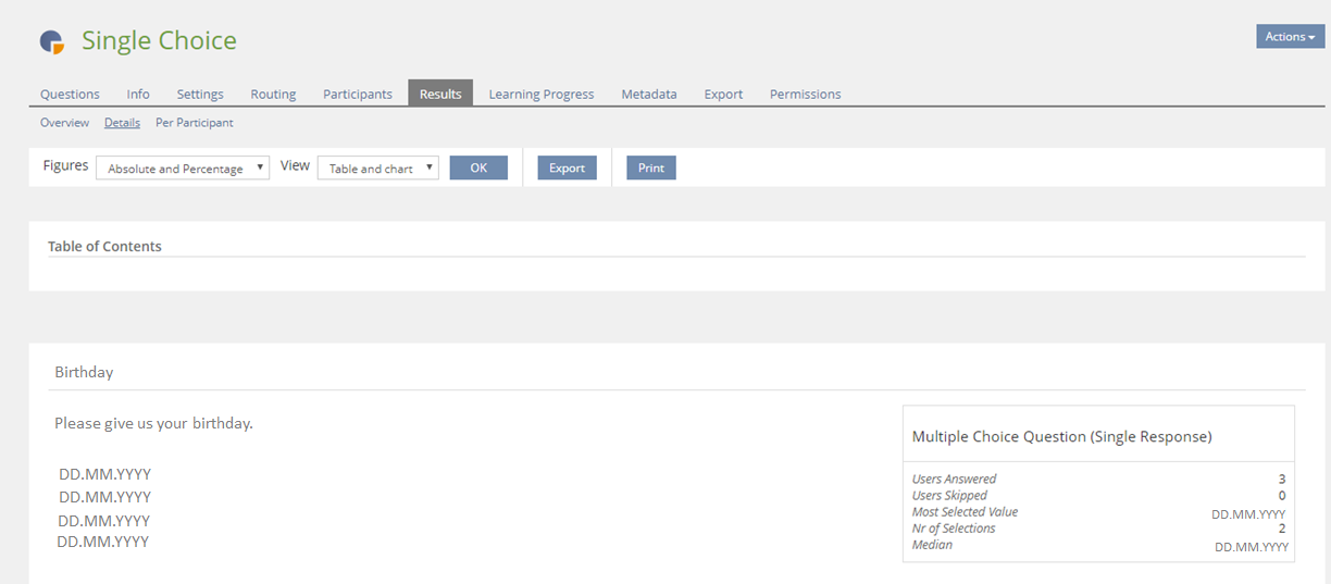Privacy: If surveys asks for birthdays we store personal data in general fields. ILIAS will not know if these fields are used for storing personal data or not. It is the responsibility of the survey creator to handle any privacy issues, e.g. to provide exports to users of the data they have entered and to ensure deletion of this kind of data.