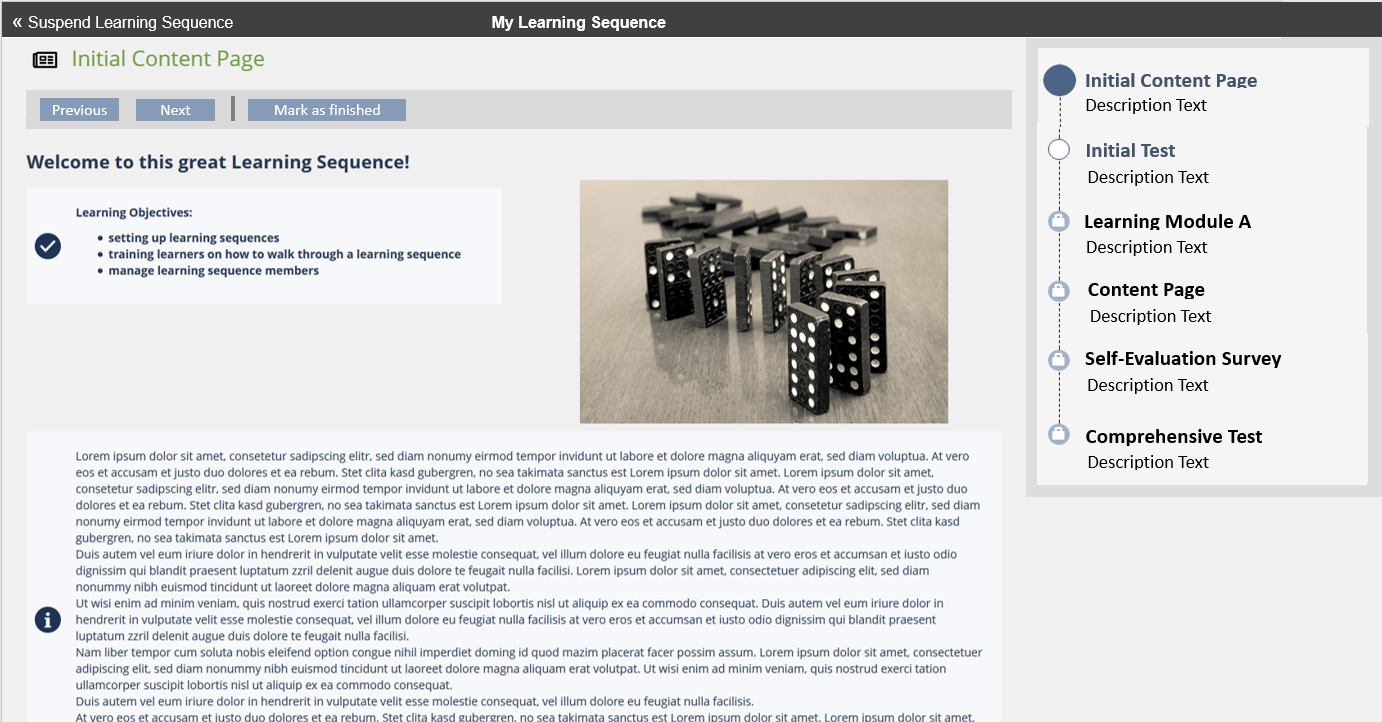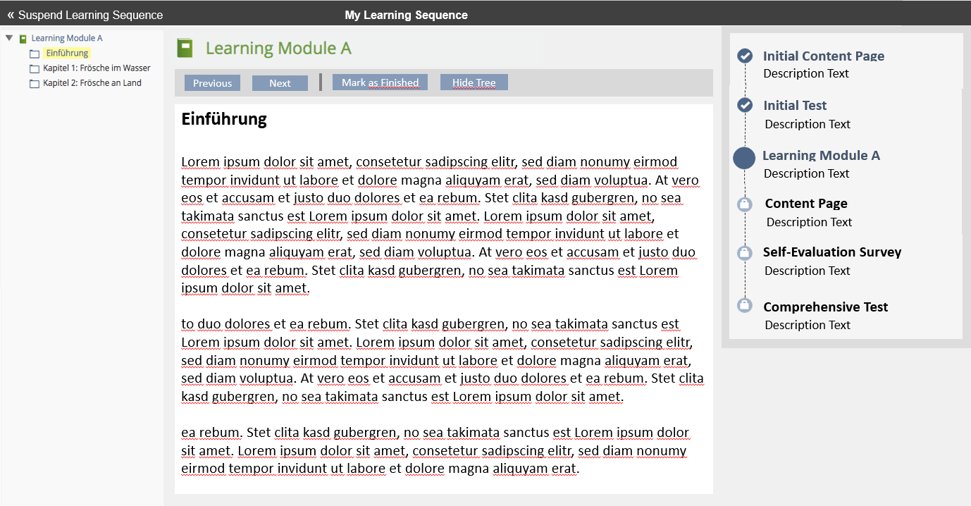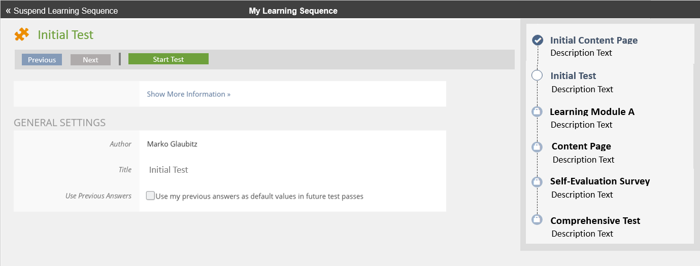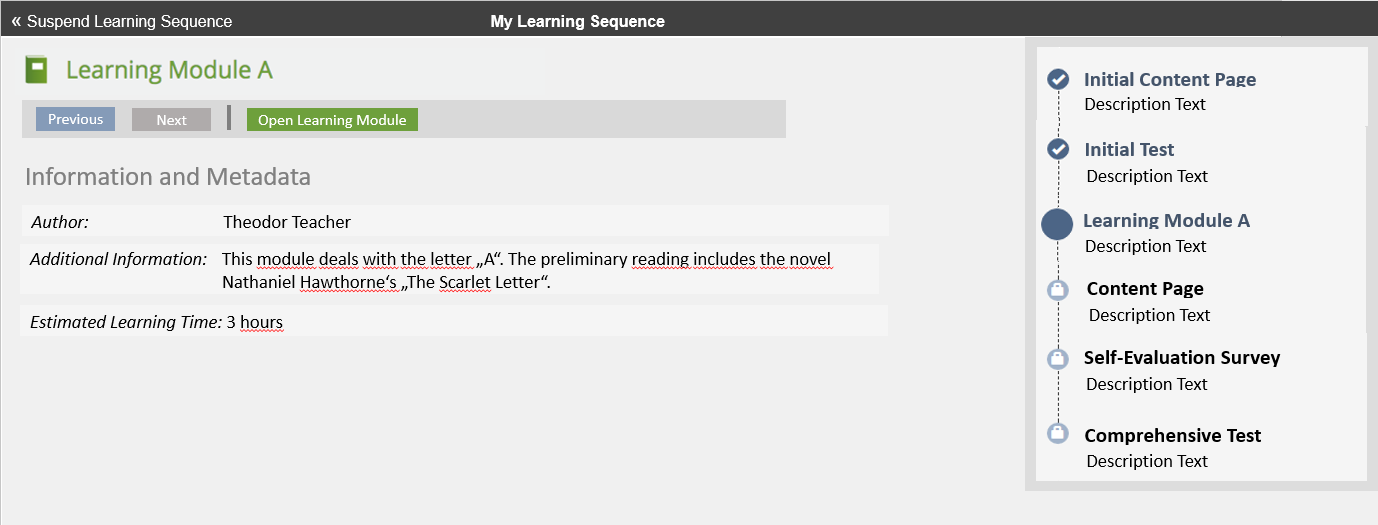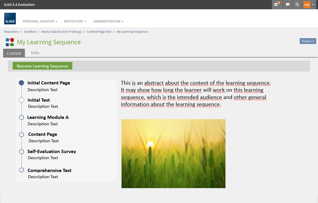 When first visiting the object, the user sees an overview of the complete sequence and an additional textual description of the content. He may then start the sequence and will see the contents of the contained objects withing the learning sequence, displayed by the kiosk mode. While progressing through the object he always sees an overview of the steps in the overall sequence and his status within these steps.