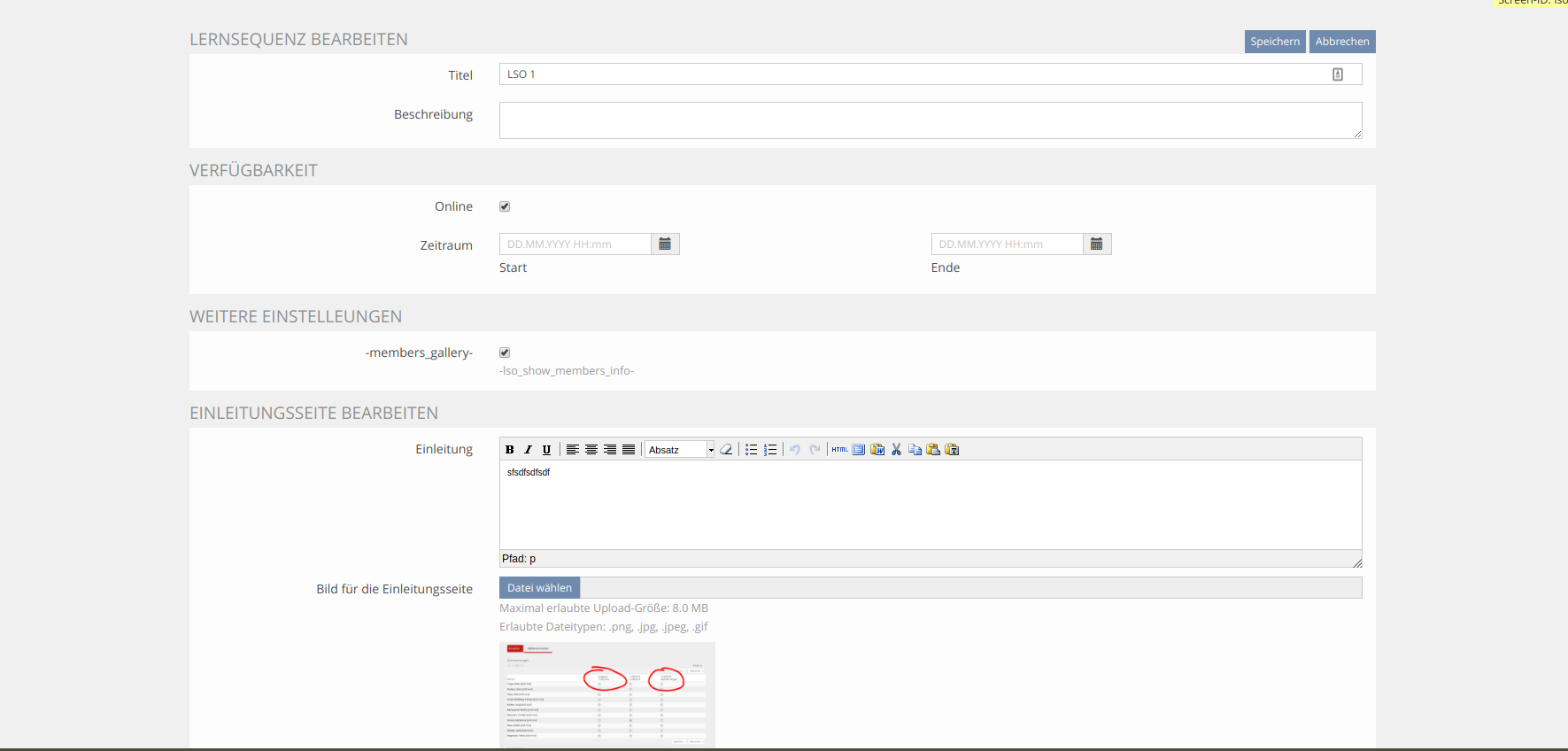 For administrators the object has a settings page that allows to make standard ILIAS-settings, set the textual description for the starting page and supports an offline-mode of the object. Members are managed via a "Members"-tab, similar to the courses "Members"-tab. Two local roles "Member" and "Administrator", together with the according role templates, are provided. The material in the container is managed via a specialized view that allows to determine the order and postconditions of the content objects easily.