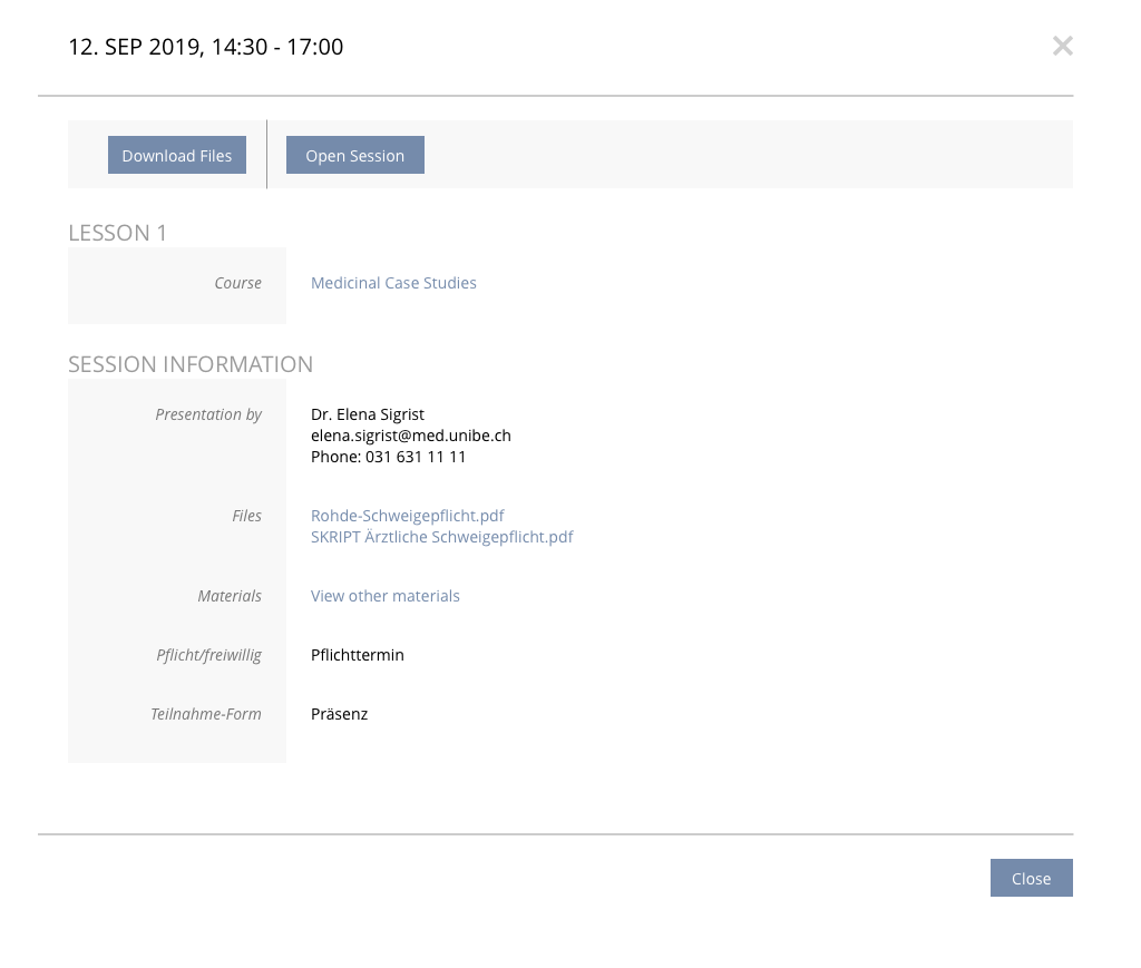 If other materials are assigned in a session along with files, a new "Materials" section appears below the "Files" section. This contains a link "View other materials" and leads to the info page of a session.